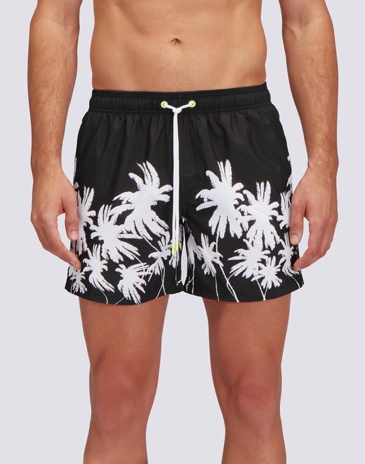 REPREVE® ELASTICATED WAIST SHORT SWIMSHORTS WITH BLACK PALM PRINT