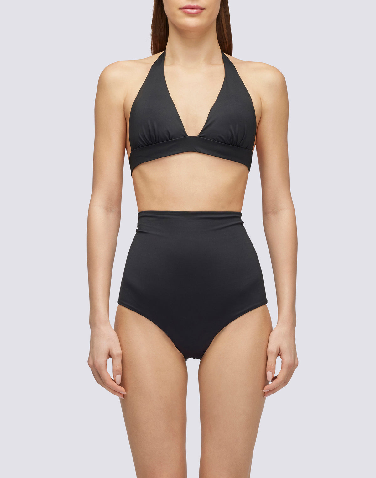 The wide-strap bikini top is designed to offer comfort, support and a dynamic look. The wide straps are the main feature, as they offer greater support than thin straps, distributing weight better and reducing pressure on the shoulders. They can be straight, crossed at the back or feature special designs. The overall line of the top is functional and minimalist. Many styles are wire-free for maximum comfort and freedom of movement and offer more coverage than other types of bikinis. Solid colours, colour blocks or simple geometric prints prevail. Although sporty in nature, this style can be paired with different types of bottoms to create more or less casual looks.