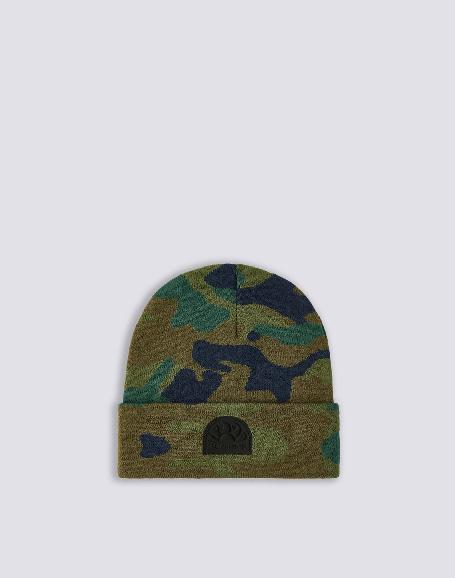 Camouflage knit hat with patch