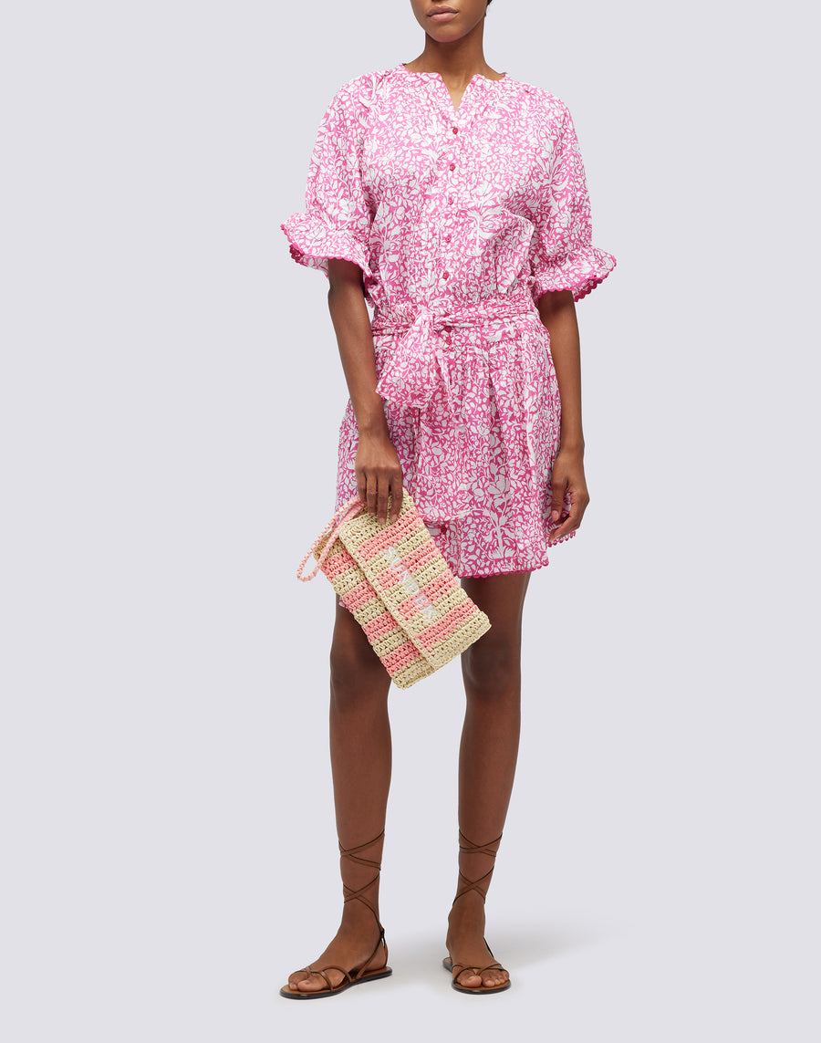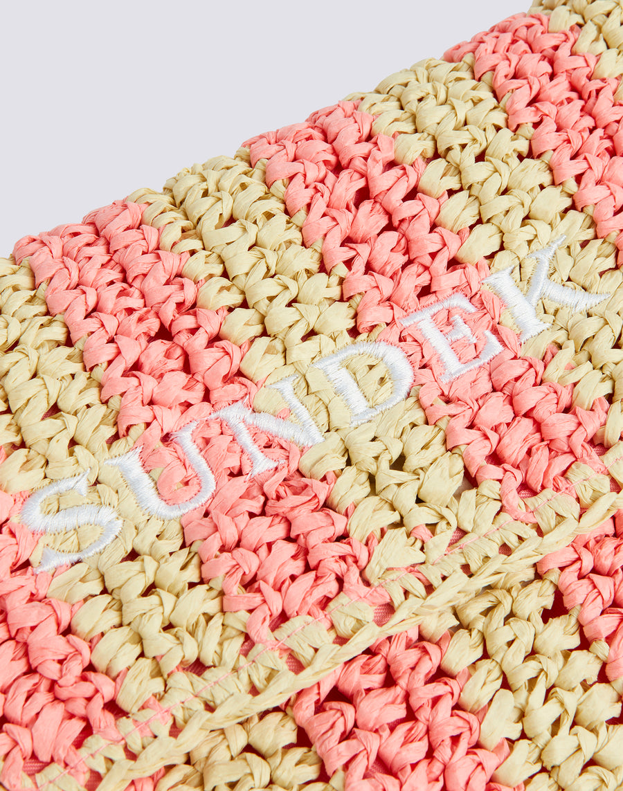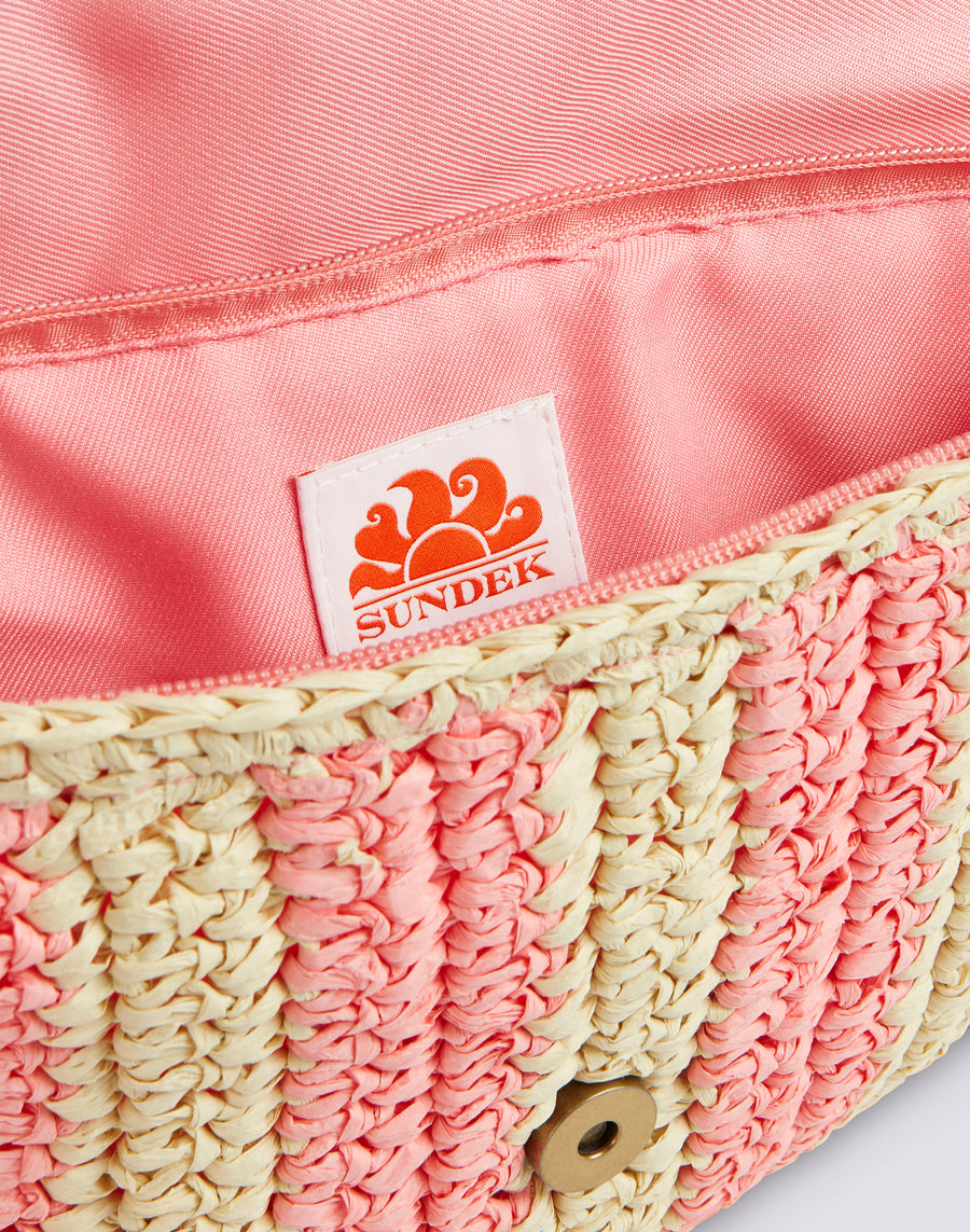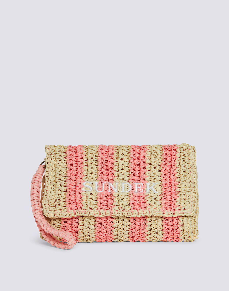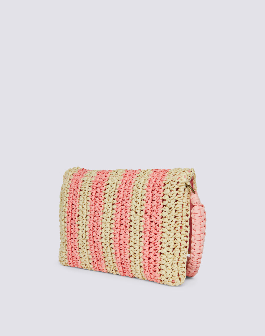 Izumi clutch bag in straw-effect paper with striped pattern. Equipped with a hand loop, it is convenient to carry around thanks to its small size. The striped pattern makes it lively and original.