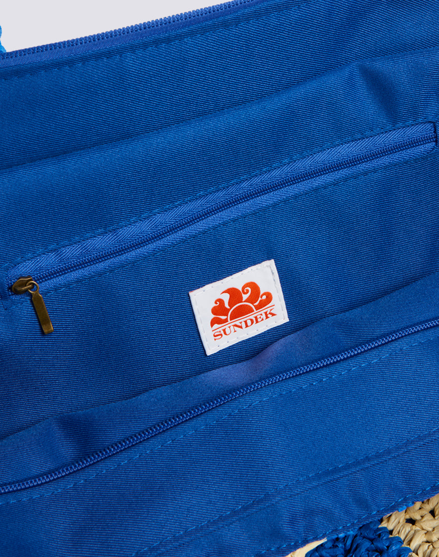 Elegant woven straw bag with embroidered logo and zip closure. Equipped with an internal mini pocket, it is perfect for the beach or for a walk in the centre, to always have everything you need with you.