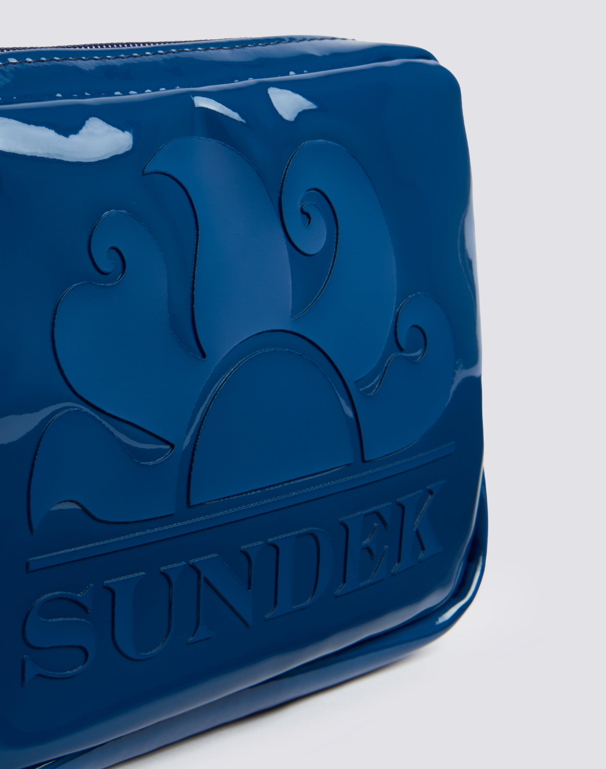 Boston clutch bag with shiny texture, zip and button fastening.
