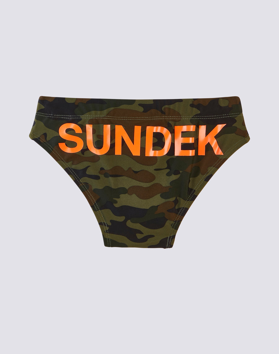 Children's swim briefs with camou print and Sundek logo printed on the back. Perfect for playing in the waves or on the beach.
