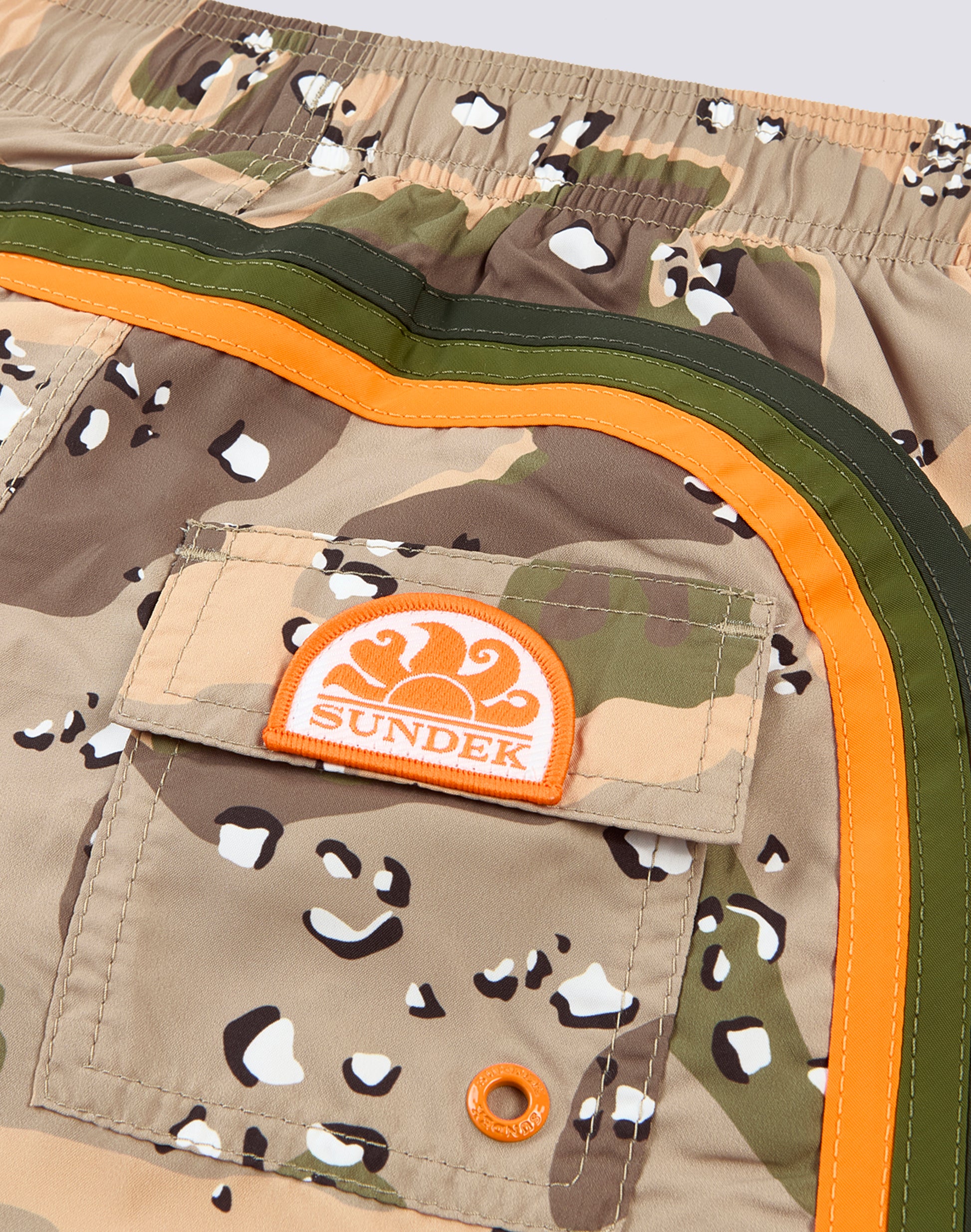 Swimshorts with elasticated drawstring waist, in lightweight Repreve® fabric recycled from plastic bottles. With Spotted Camo print and the traditional Sundek rainbow on the back. Outer thigh length 10.25"/26 cm (in size 6 years).