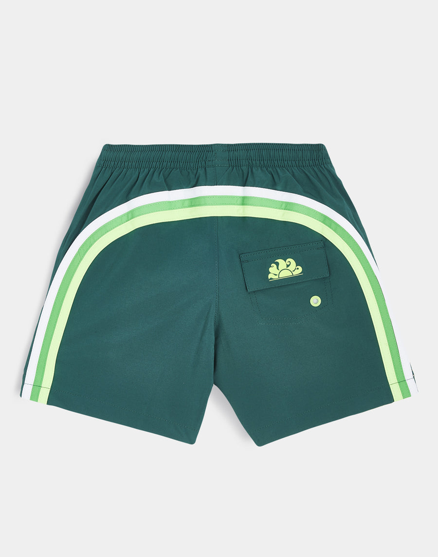 Intense color and ultra-comfortable, quick-drying fabric for these boy's beach shorts. A model that will accompany your child in his many activities on holiday, perfect for moving and playing freely. Lightweight, resistant, dries very quickly and is made of 4 Way Stretch fabric. It has our classic tri-needle stitching for added durability and our iconic rainbow to the reverse.