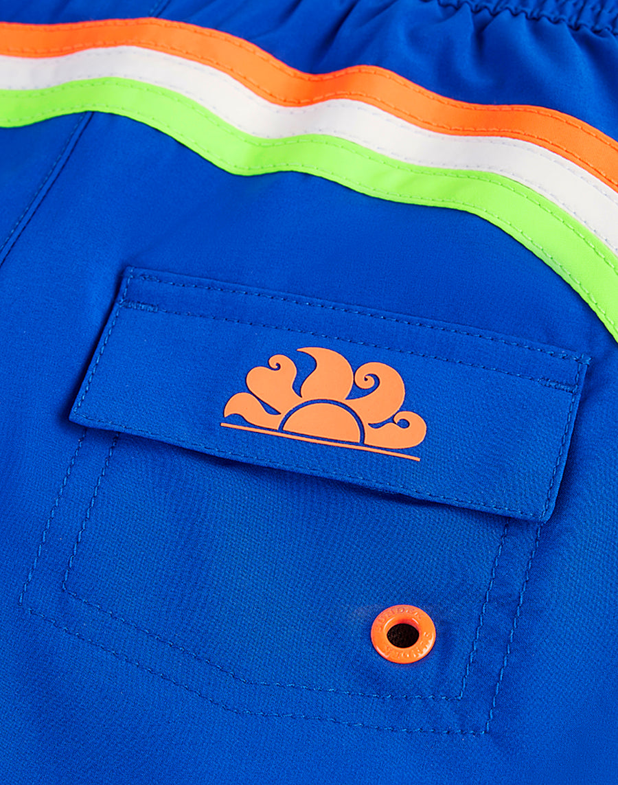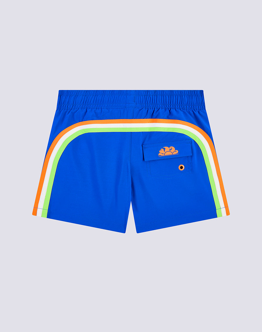Intense color and hyper-comfortable, quick-drying fabric for these boys' swim shorts. A model that will accompany your child in his thousand holiday activities, perfect for moving and playing in complete freedom. Lightweight, resistant, dries very quickly and is made of 4 Way Stretch fabric. It has our classic three-needle stitching that increases durability and our iconic rainbow on the back.
