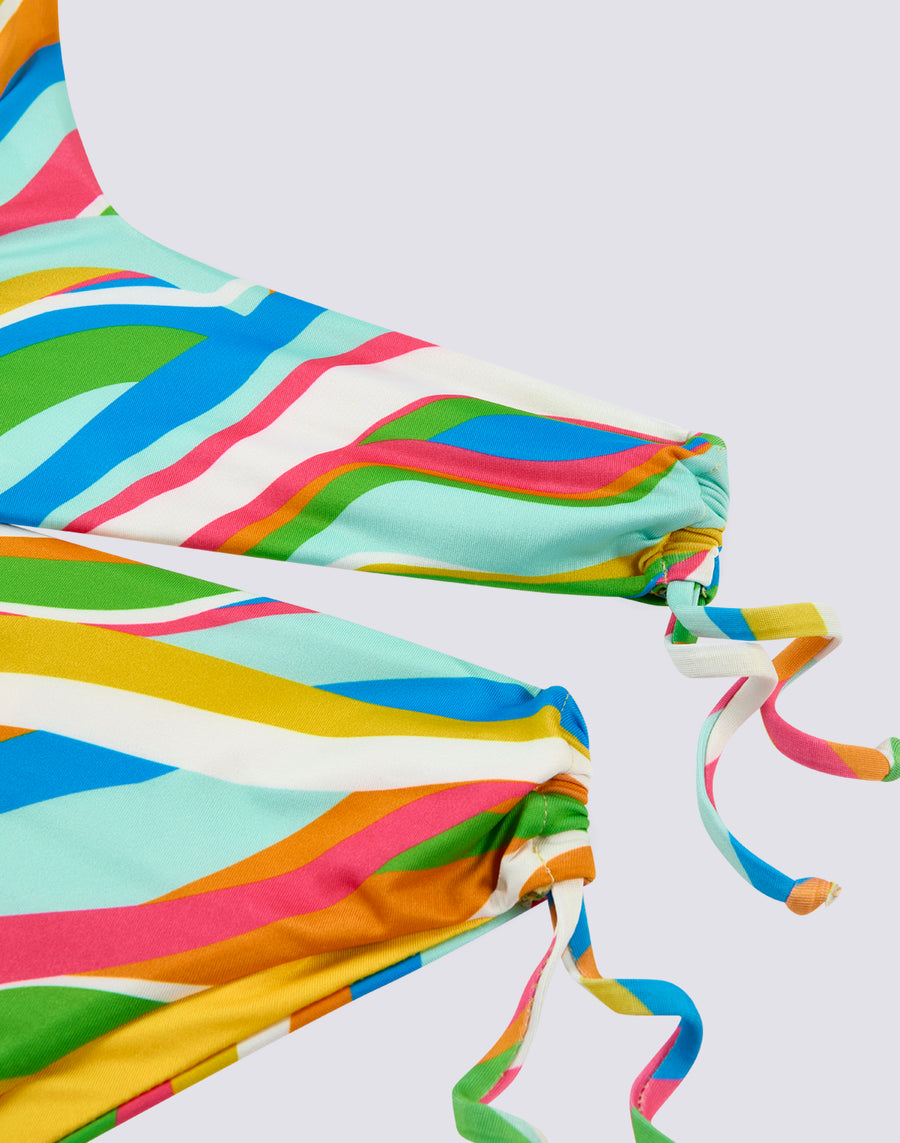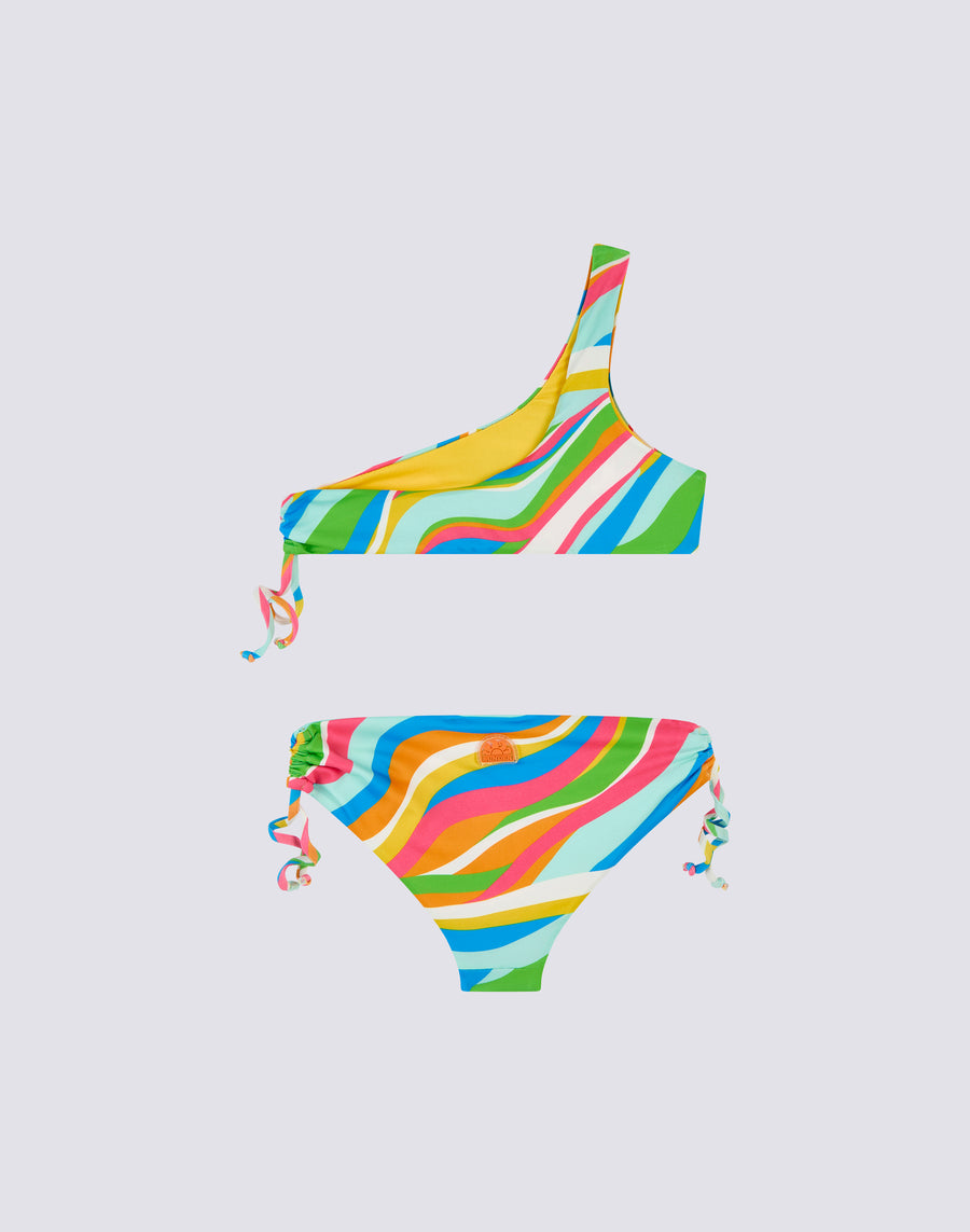 Multicolour girl's bikini, consisting of a one-shoulder top and fixed briefs with side drawstrings.