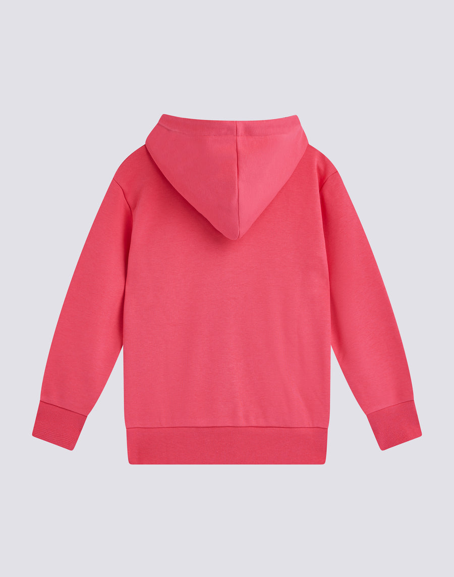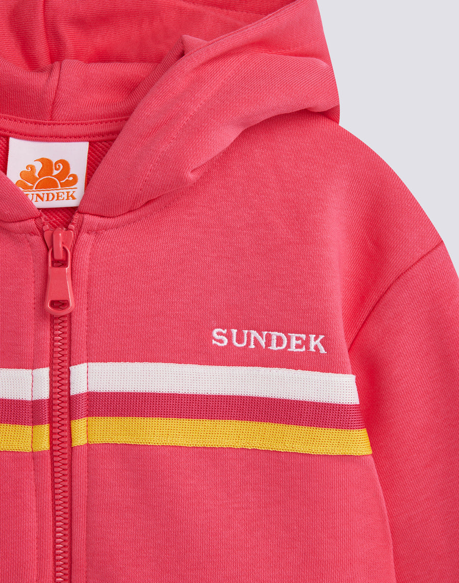 Girl's hooded sweatshirt with full central zip, pockets and rainbow tricolour detail. Combine with long trousers or fleece Bermuda shorts for a colourful and lively outfit.