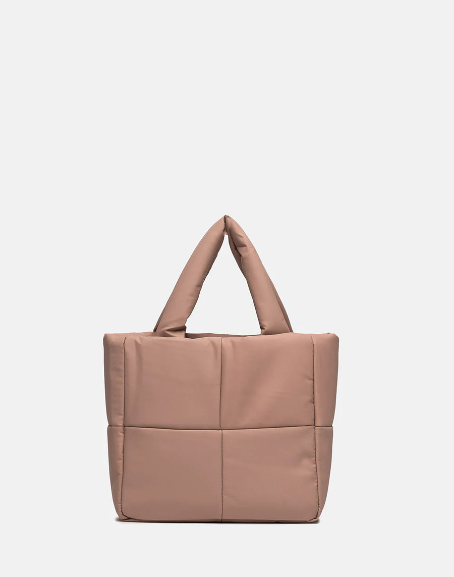 Quilted effect regular shopping bag. The open design features two comfortable handles and a tone-on-tone printed logo. Detachable crossbody strap