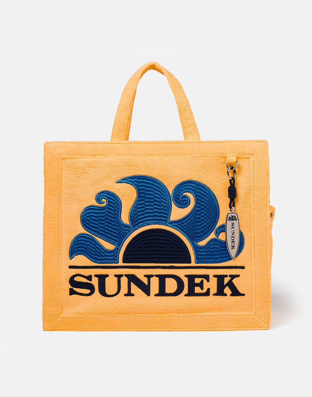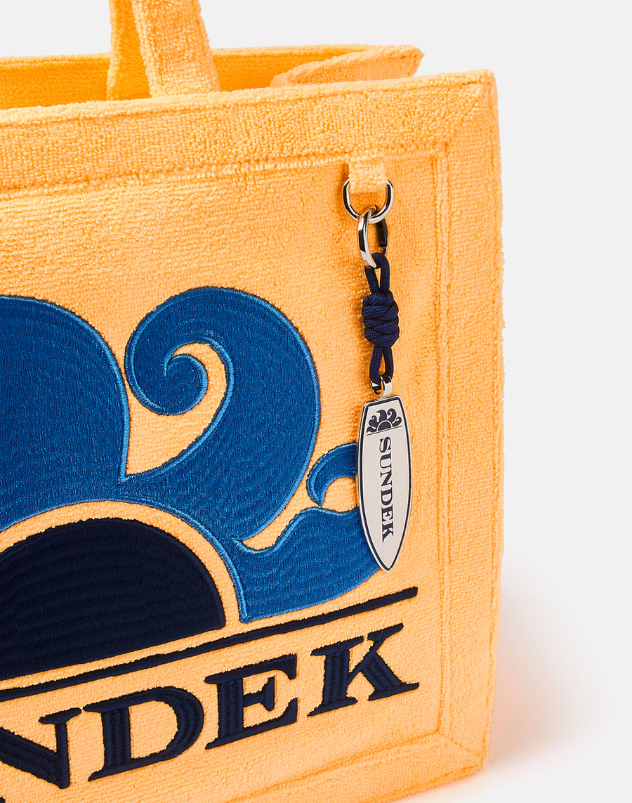 Towelling beach bag with an embroidered logo. Iconic surfboard charm