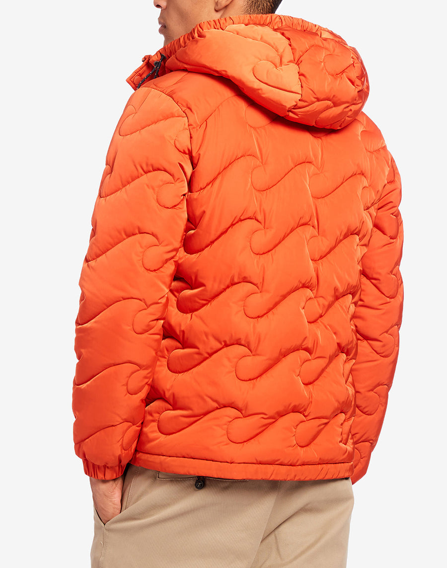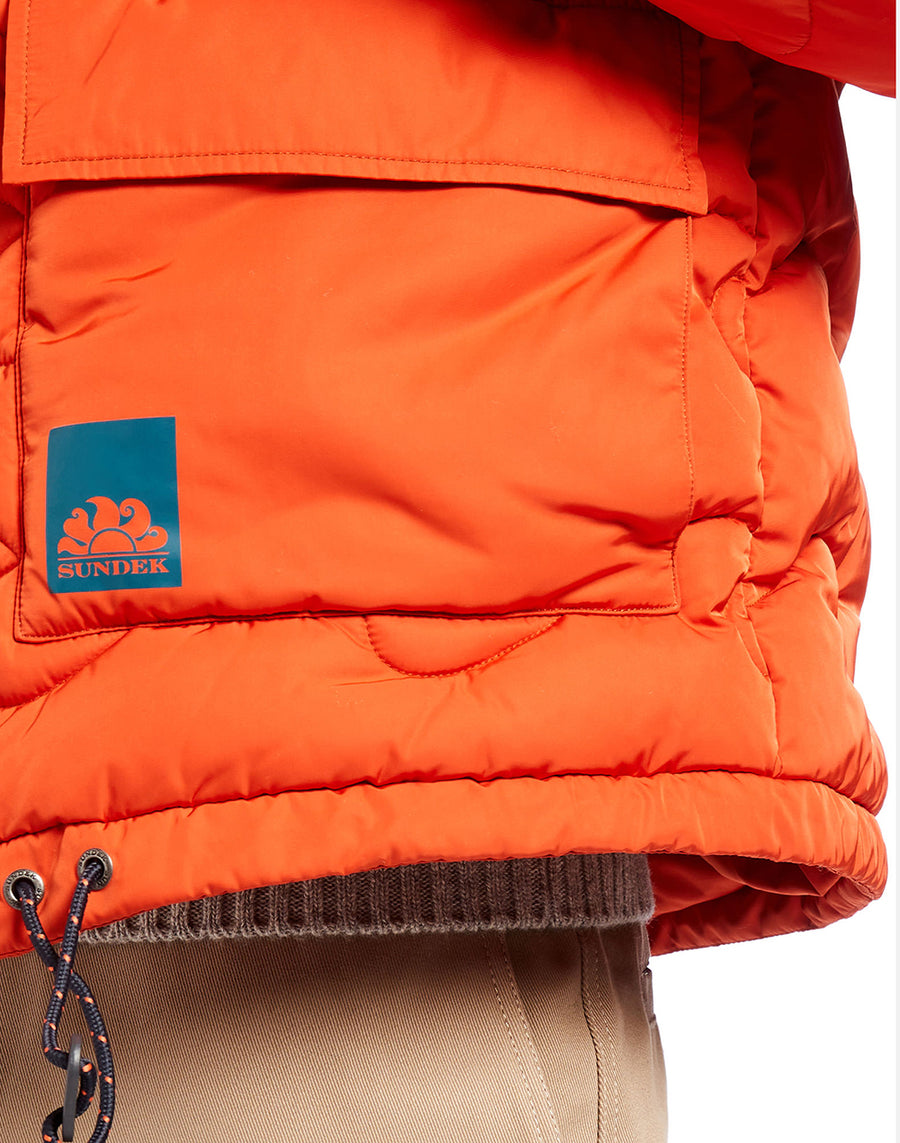 Heavy wave quilted down jacket with hood in Eco Sorona.