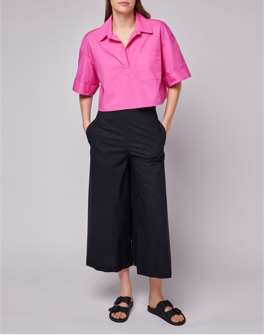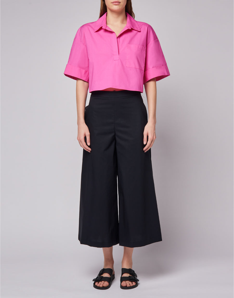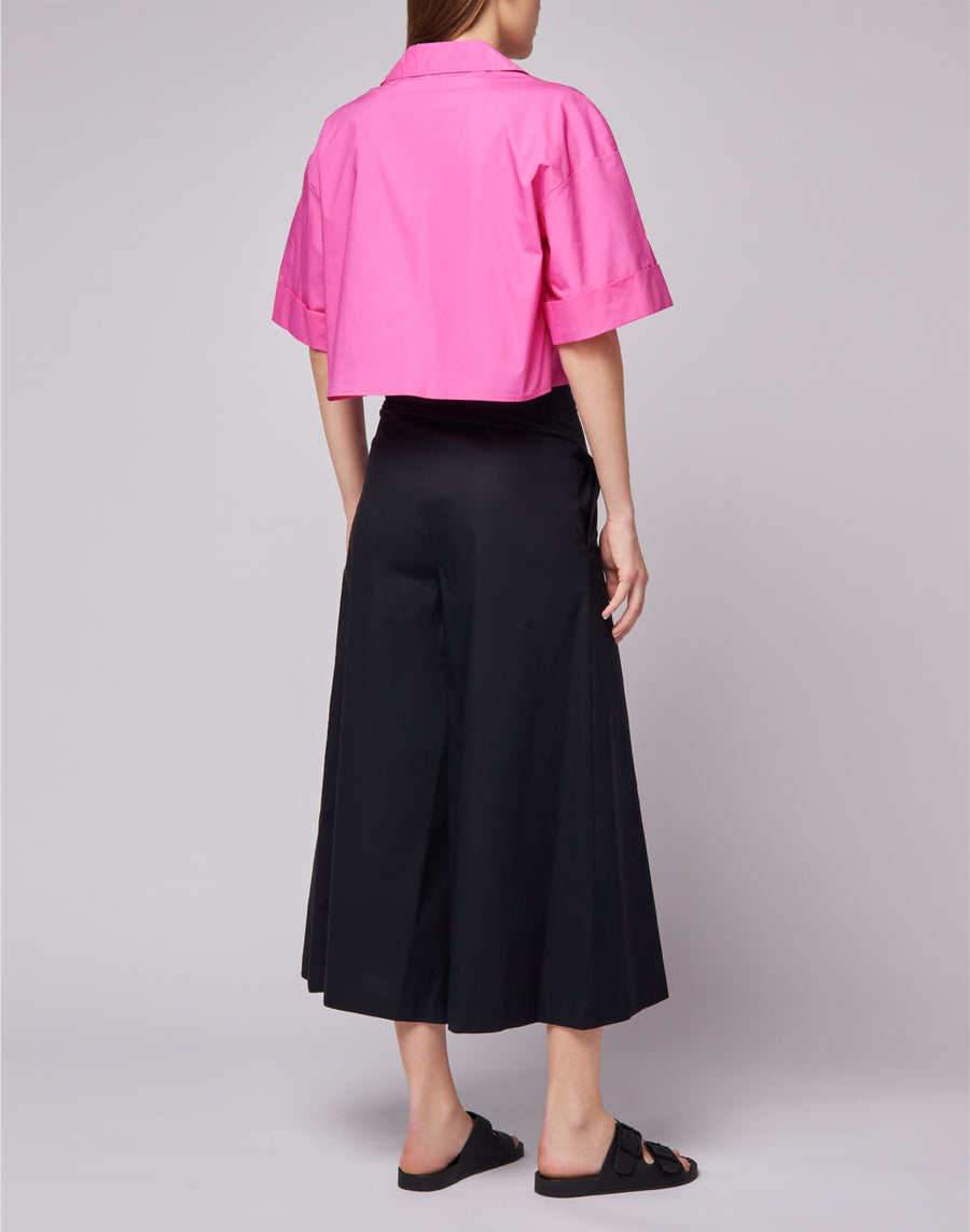 Short-sleeved poplin shirt with front pocket and wide opening. Ideal over a skirt, pants or shorts.