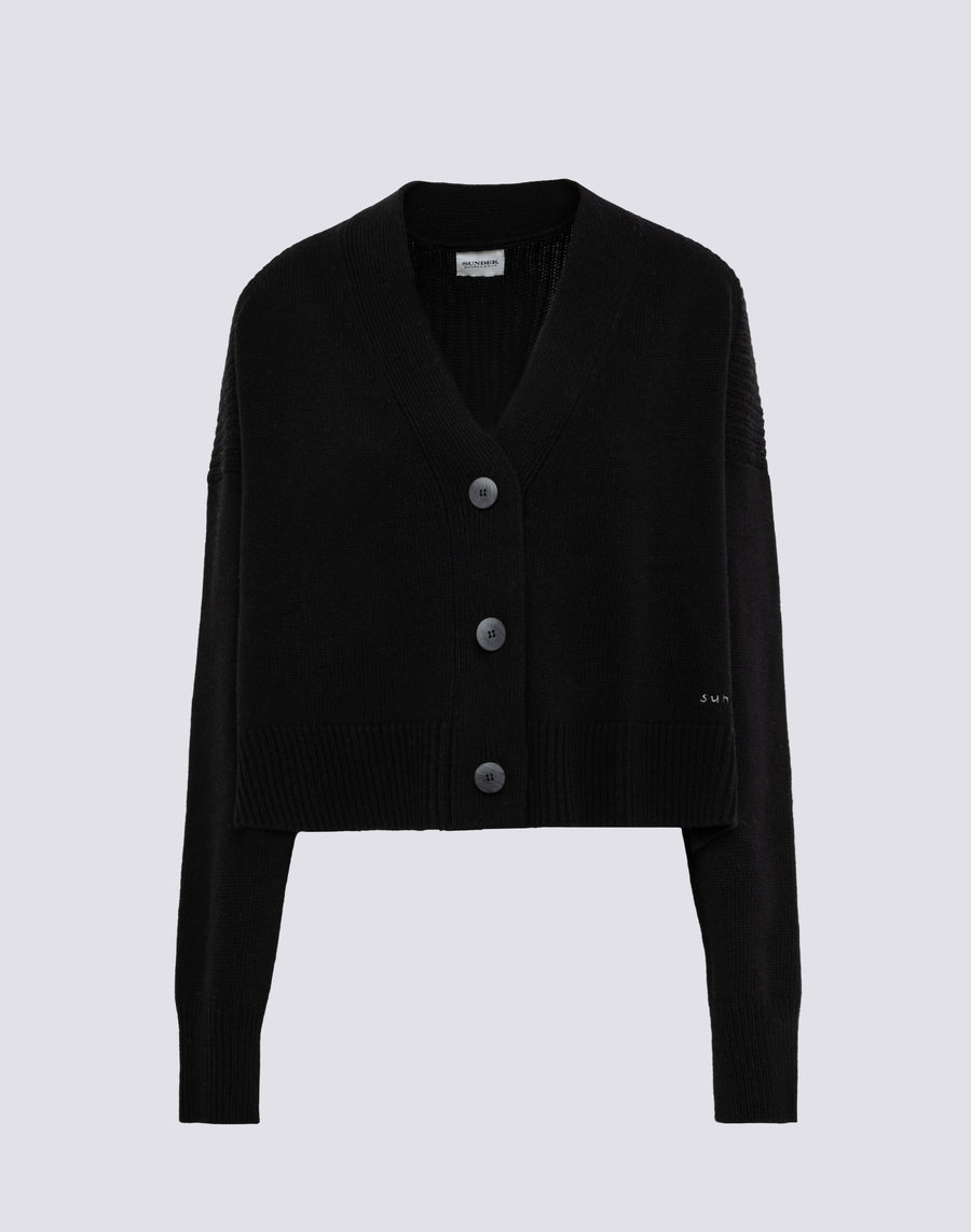 Fine merino wool knitted cardigan with buttons and side slits. A warm and comfortable wardrobe staple, it can adapt to suit all your outfits.