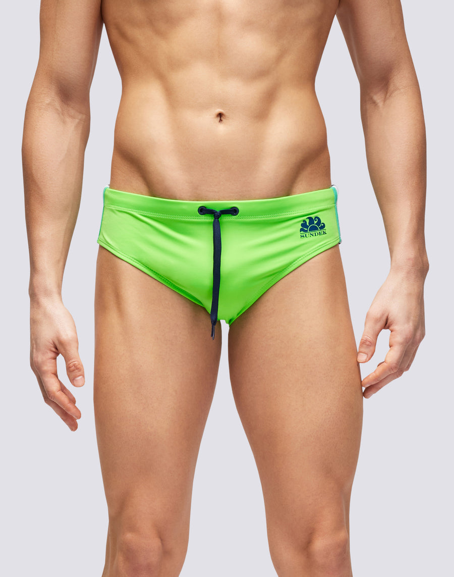 Men's plain briefs with an adjustable waistband Monochrome swim briefs with a drawstring and three contrasting stripes down the sides, combining bold style with functionality. Designed to dry quickly, they ensure comfort and durability in and out of the water.