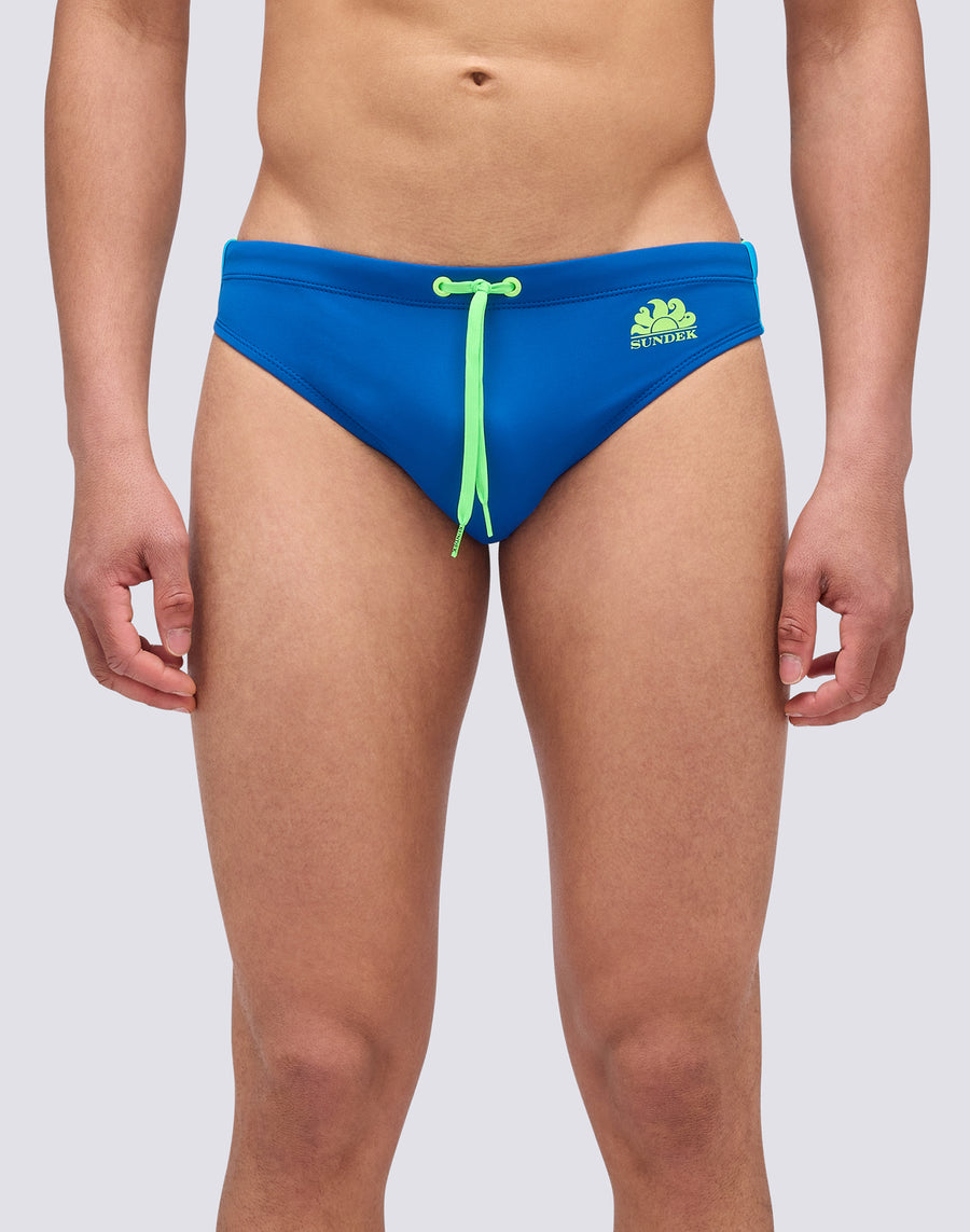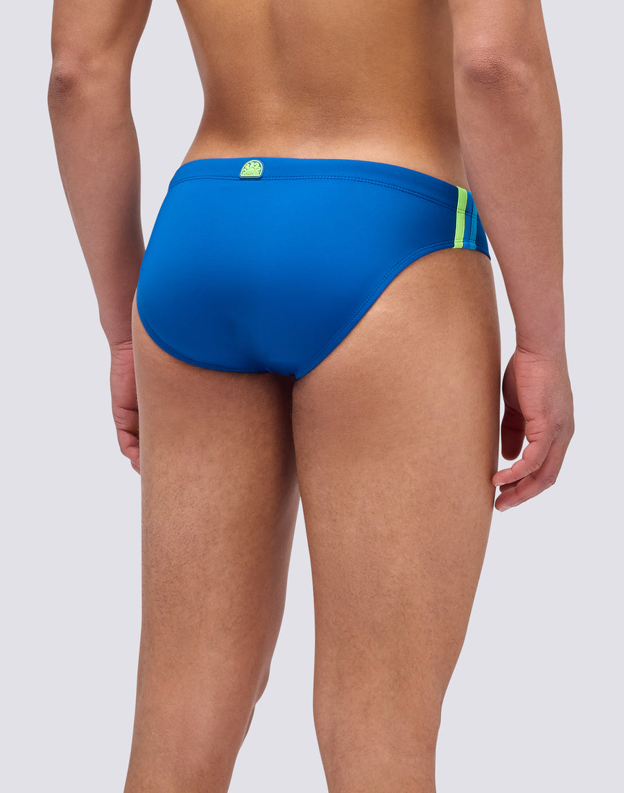 Solid color men's swimsuit briefs with adjustable waist. The monochrome swim briefs with drawstring and three contrasting colored side bands for a strong and functional look. It dries quickly and gives you comfort and durability in and out of the water: wear it for swimming and training and when you rest and sunbathe.
