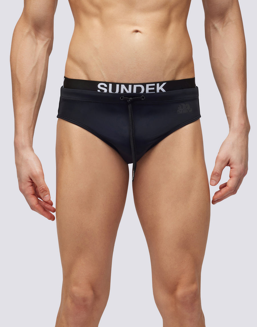 Men's swim briefs with logo elastic and drawstring. Made of Econyl®, regenerated nylon. External side bands length: 3.25"/8 cm (in size M).