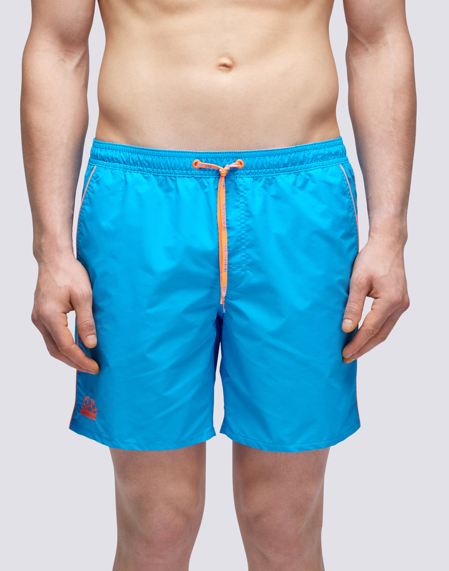 The elastic waistband with drawstring ribbon makes this men's swim trunks comfortable to wear. The three-needle stitching guarantees durability over time. Length 41 cm (size M), measured on the outside of the leg.