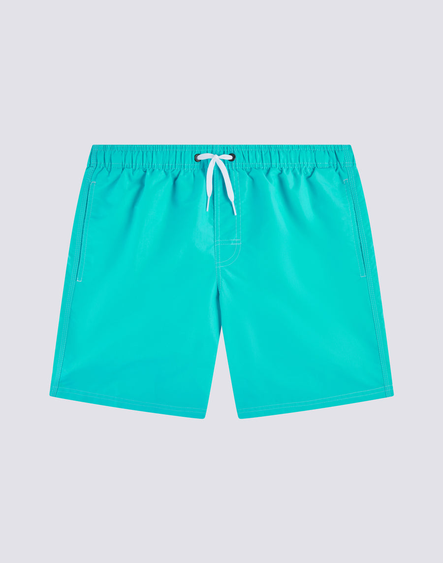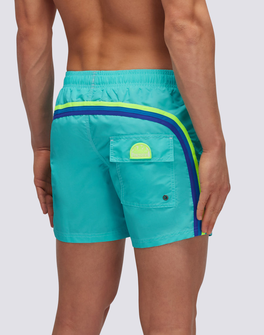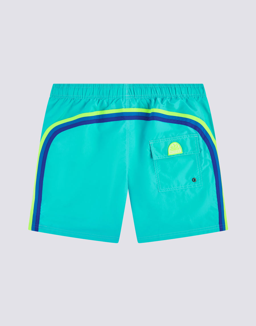 Short men's swim shorts with elasticated waist, drawstring and iconic Sundek rainbow on the back. This swimsuit is made with three-needle stitching and 100% of our historic fabric, nylon-taffeta: smooth as silk, light and resistant to everything, it dries very quickly to give you comfort everywhere, in the waves and outside waterfall. Length 35 cm (size M), measured on the outside of the leg.