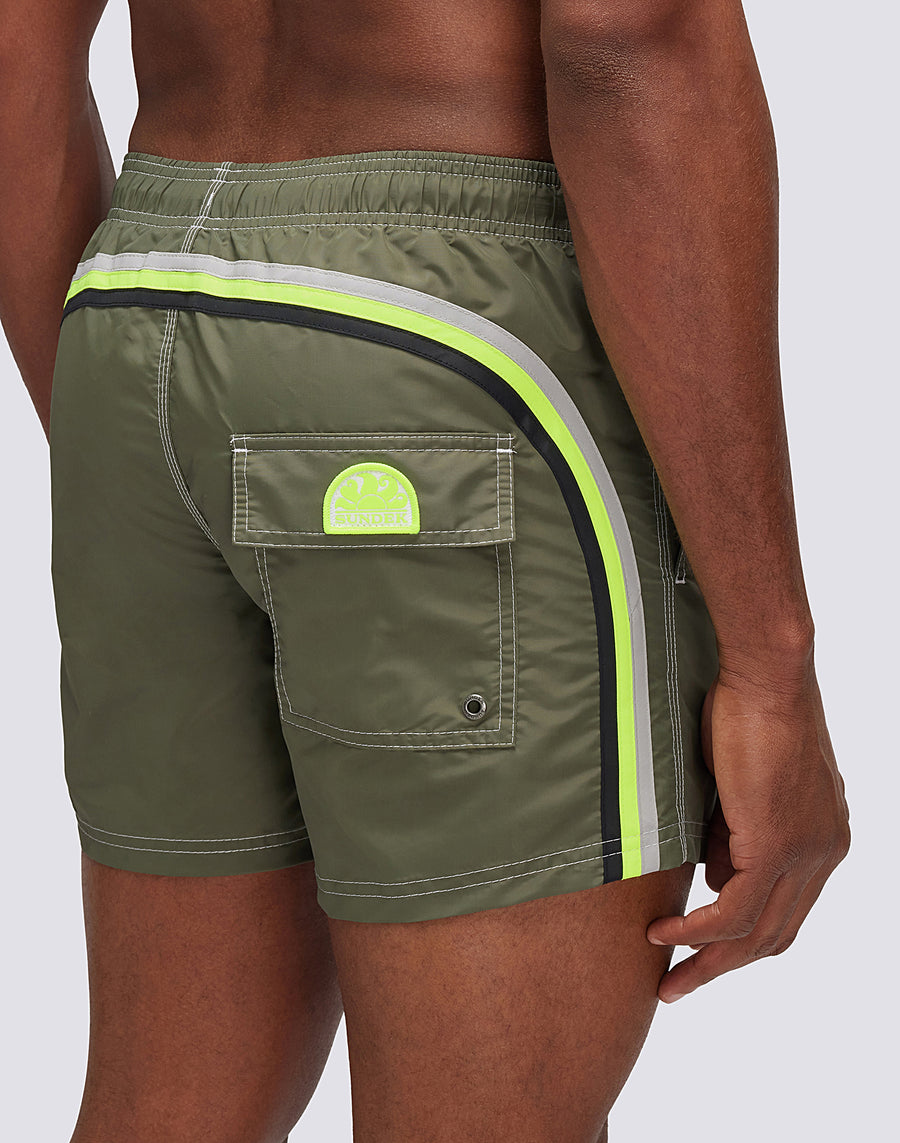 Short men's swim shorts with an elasticized waist, drawstring and iconic Sundek rainbow on the back. This swimsuit is made with three-needle stitching and 100 percent with our historic fabric, nylon-taffeta: silky smooth, lightweight and resistant to everything, it dries super fast to give you comfort everywhere, in the waves and out of the water. Length 35 cm (size M), measured on the outside of the leg.