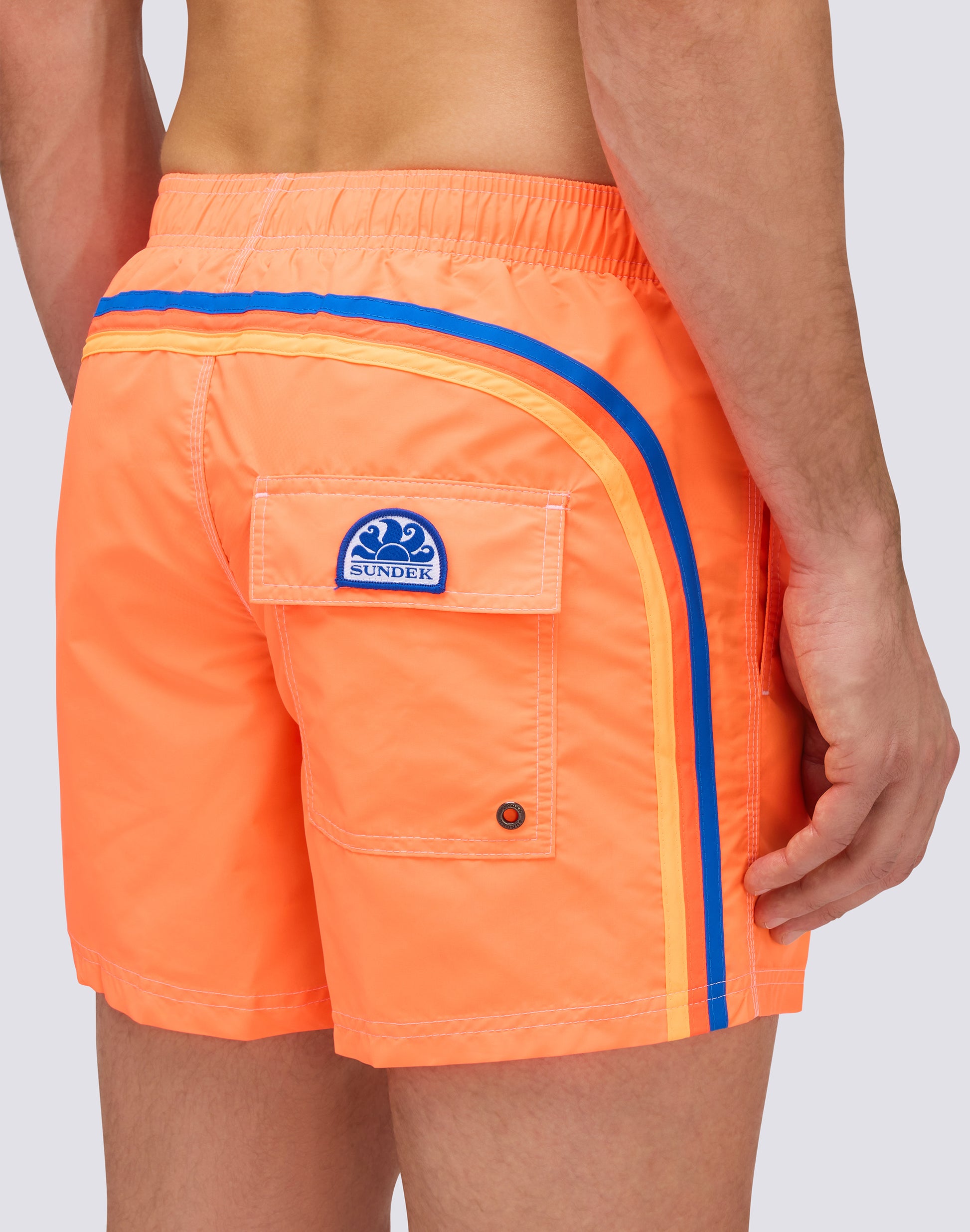 The M504BDTA100 men's short swimsuit embodies the essence of Sundek style: the perfect balance between iconic design, absolute comfort and quality. These elasticated waist beach shorts are the ideal companion for those seeking freedom of movement, quick drying and unmistakable style. Made from 100% nylon taffeta, the fabric that has made Sundek famous since 1958, these swim shorts offer a silky texture, exceptional lightness and extraordinary durability. Ultra-fast drying ensures immediate comfort, both in the waves and out of the water, allowing you to transition effortlessly from the beach to aperitif time. Featuring the unmistakable Sundek rainbow on the back, a symbol of the brand's authenticity and heritage, these swim shorts have an elasticated waist with an adjustable drawstring for a customised fit. The three-needle stitching ensures maximum strength and durability, even after countless sessions of surfing, swimming and sunbathing. Versatile and high-performance, perfect for surfing, swimming, beach volleyball and leisure, these men's swim shorts combine technical performance and casual style. The 35 cm length (in size M) offers a modern and sporty fit, ideal for those who love freedom of movement.