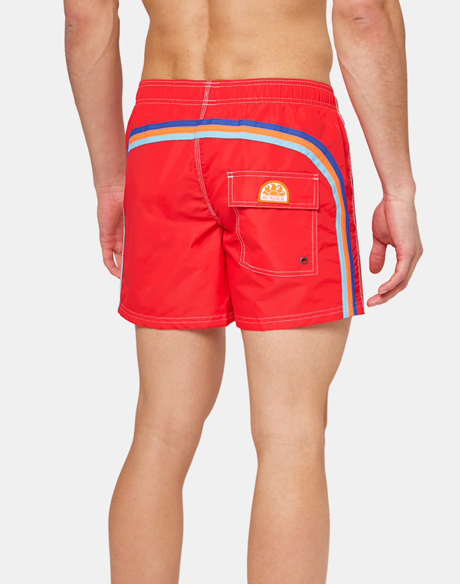 Short men's swim shorts with an elasticized waist, drawstring and iconic Sundek rainbow on the back. This swimsuit is made with three-needle stitching and 100 percent with our historic fabric, nylon-taffeta: silky smooth, lightweight and resistant to everything, it dries super fast to give you comfort anywhere, in the waves and out of the water.