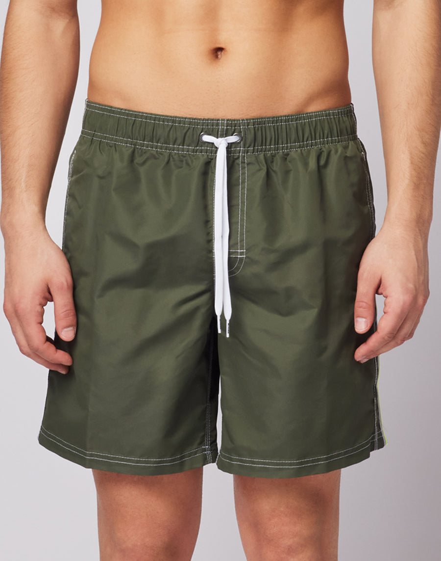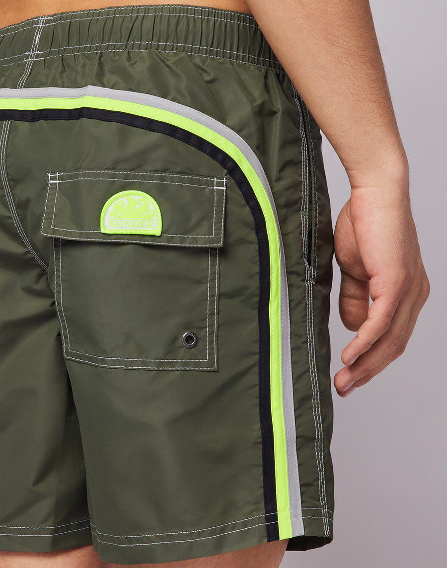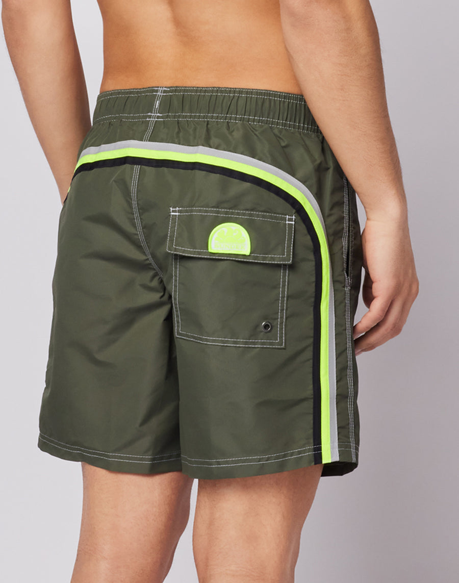 All of Sundek's timeless style in this mid-length boardshort with elasticated waist. Stylish, comfortable, and destined to last holiday after holiday: this is our classic boardshort with drawstring waist and contrasting rainbow on the back, made in our historic lightweight, quick-drying, durable nylon taffeta fabric with three-needle stitching for extra reinforcement. Length 41 cm (size M), measured on the outside of the leg.