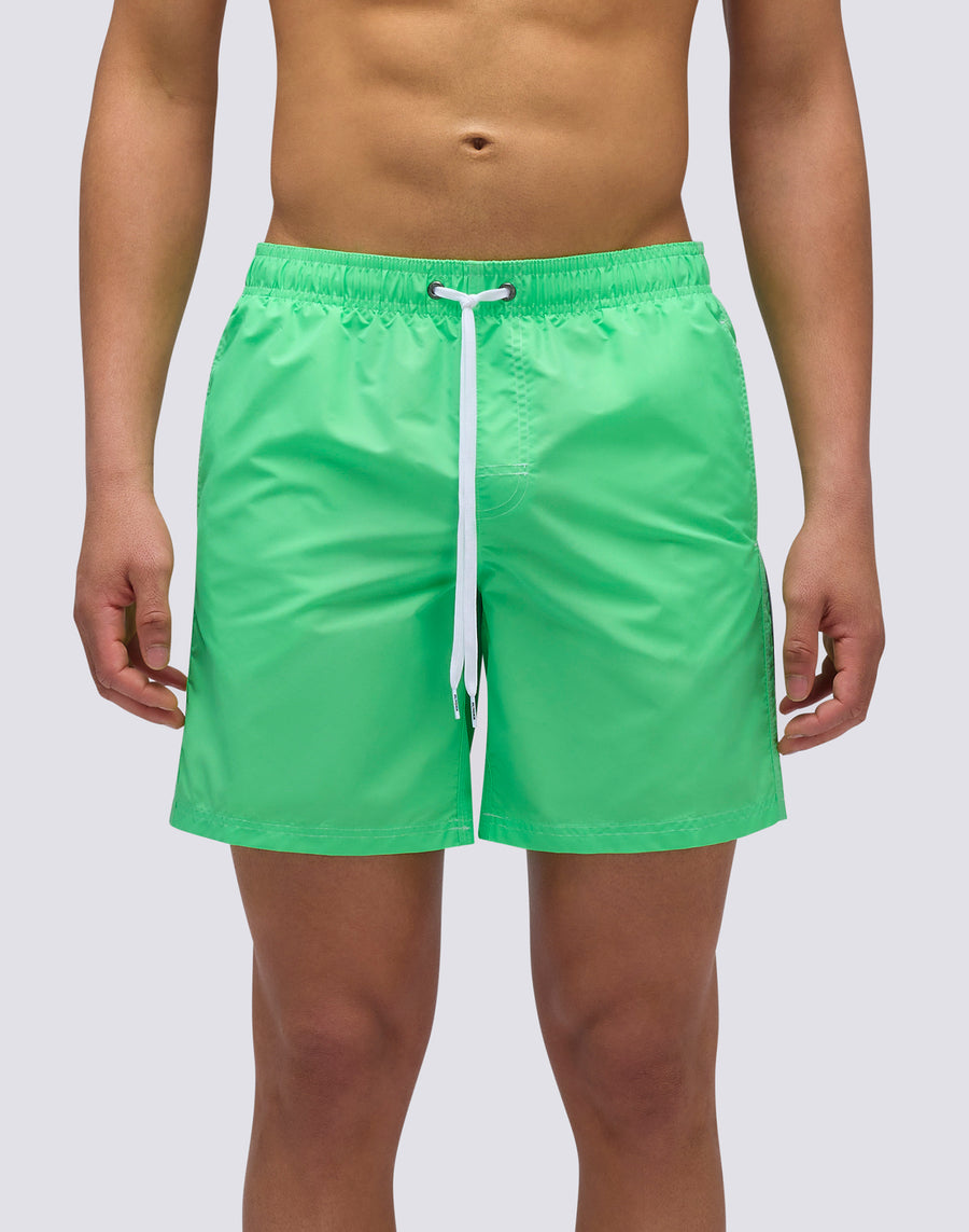 All the timeless Sundek style in this mid-length boardshort with an elasticated waist. Stylish, comfortable, designed to last holiday after holiday: it's our classic boardshort with drawstring waist and contrasting rainbow on the back, made from our historic lightweight and quick-drying nylon taffeta fabric, durable, with three-needle stitching for a further reinforcement. Length 41 cm (size M), measured on the outside of the leg.