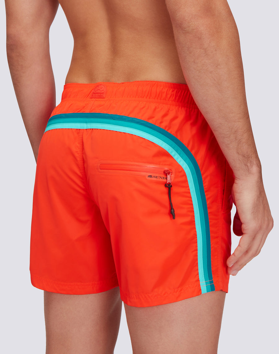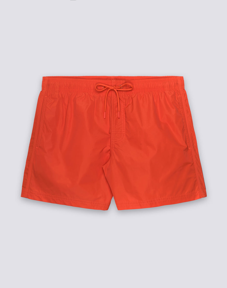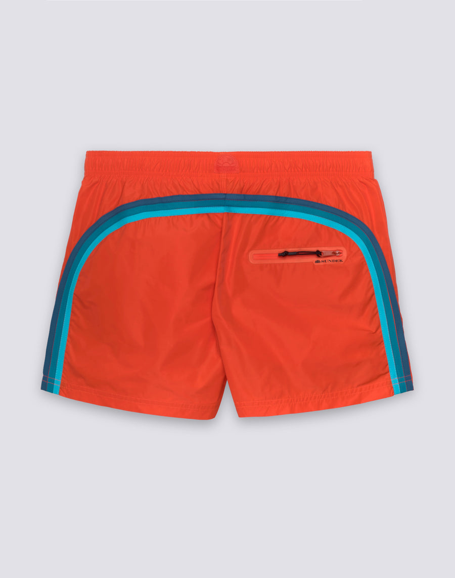 Short men's swimsuit in solid color with bright colors and the detail of the heat-sealed zip that closes the back pocket. Lightweight, resistant, dries very quickly and is made of memory polyester, a technical fabric that maintains its shape over time. It has our classic three-needle stitching that increases durability and our iconic rainbow on the back.