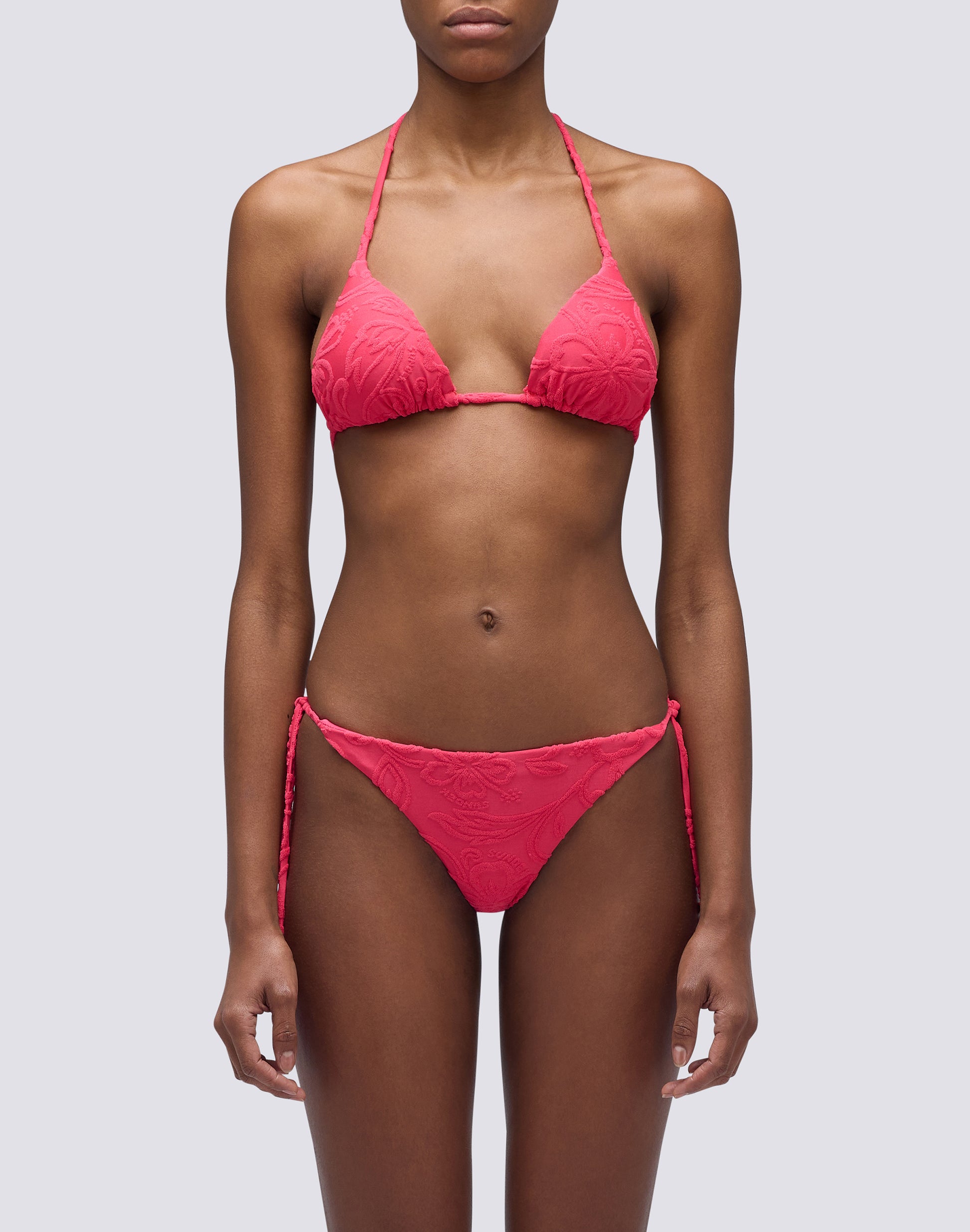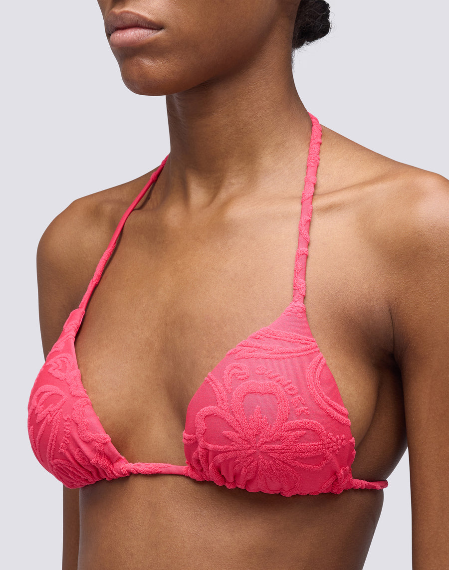 Jennifer jacquard terry triangle top with Hibiscus pattern, adjustable ties and coloured cubic beads. Matching briefs sold separately.