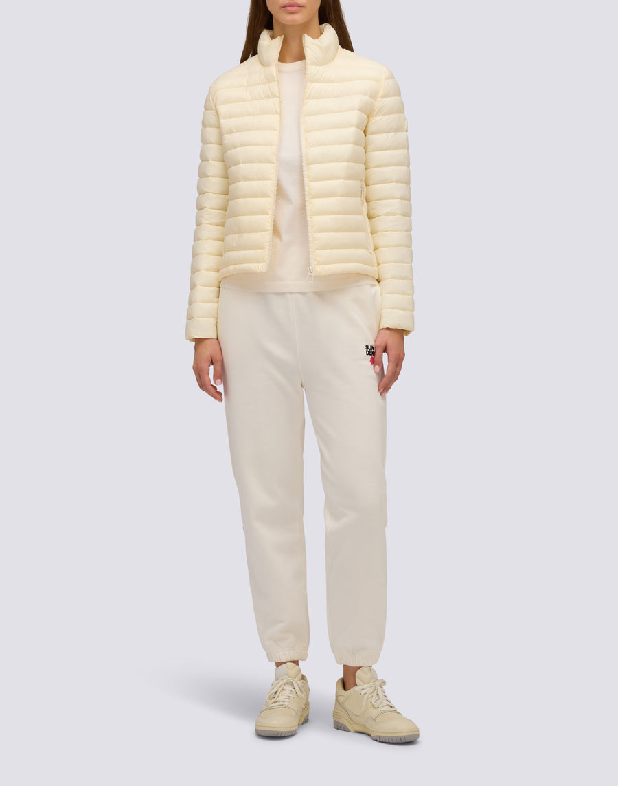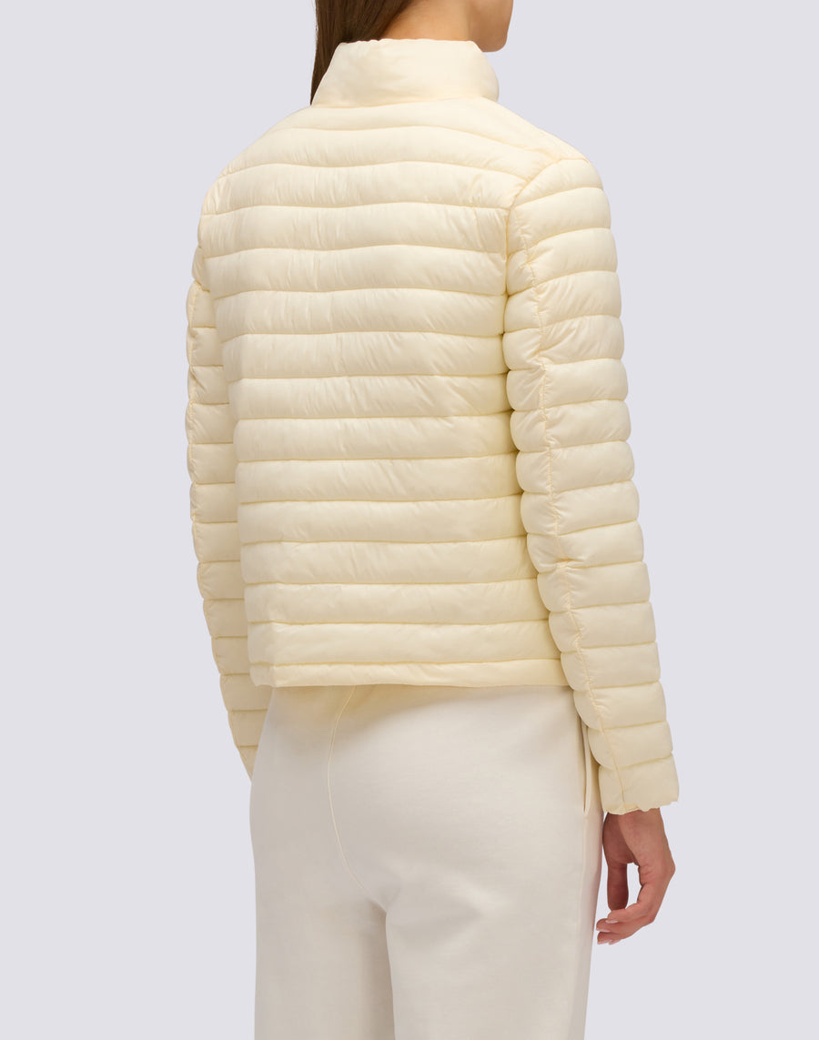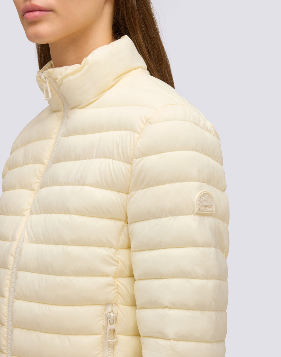 Women's short down jacket with a stand-up collar in superlight matte nylon, quilted with horizontal channels. The padding is made with an innovative synthetic fiber, Repreve, which provides lightweight protection from the cold. The piece is completed with a logo-printed nylon jacket with an adjustable drawstring. Regular fit and medium warmth.