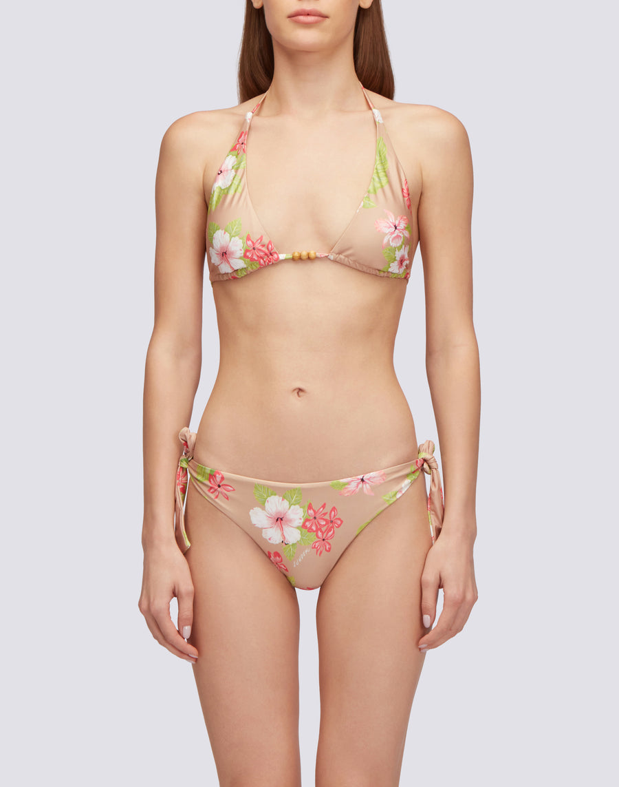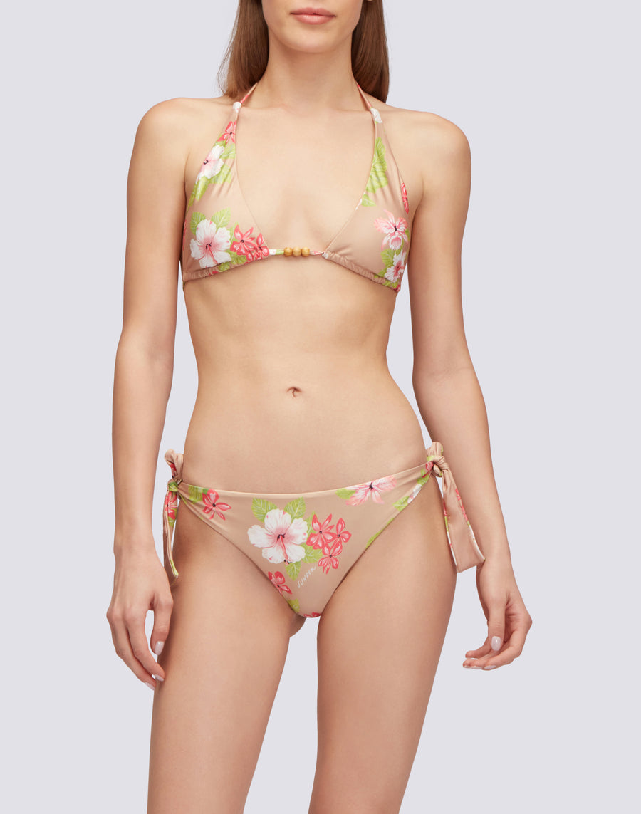 Garbo American triangle top in Dreamy Hawaii print, with wooden beads decorating the ties. Removable padding and regular fit. Matching briefs sold separately.