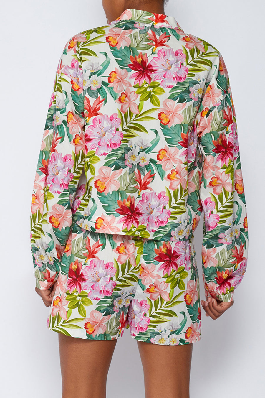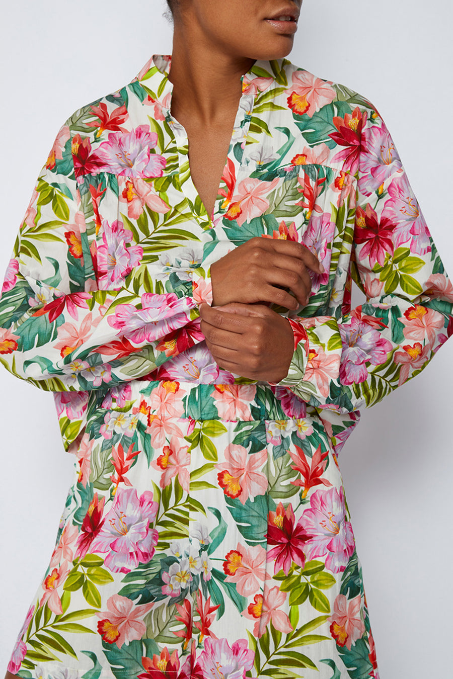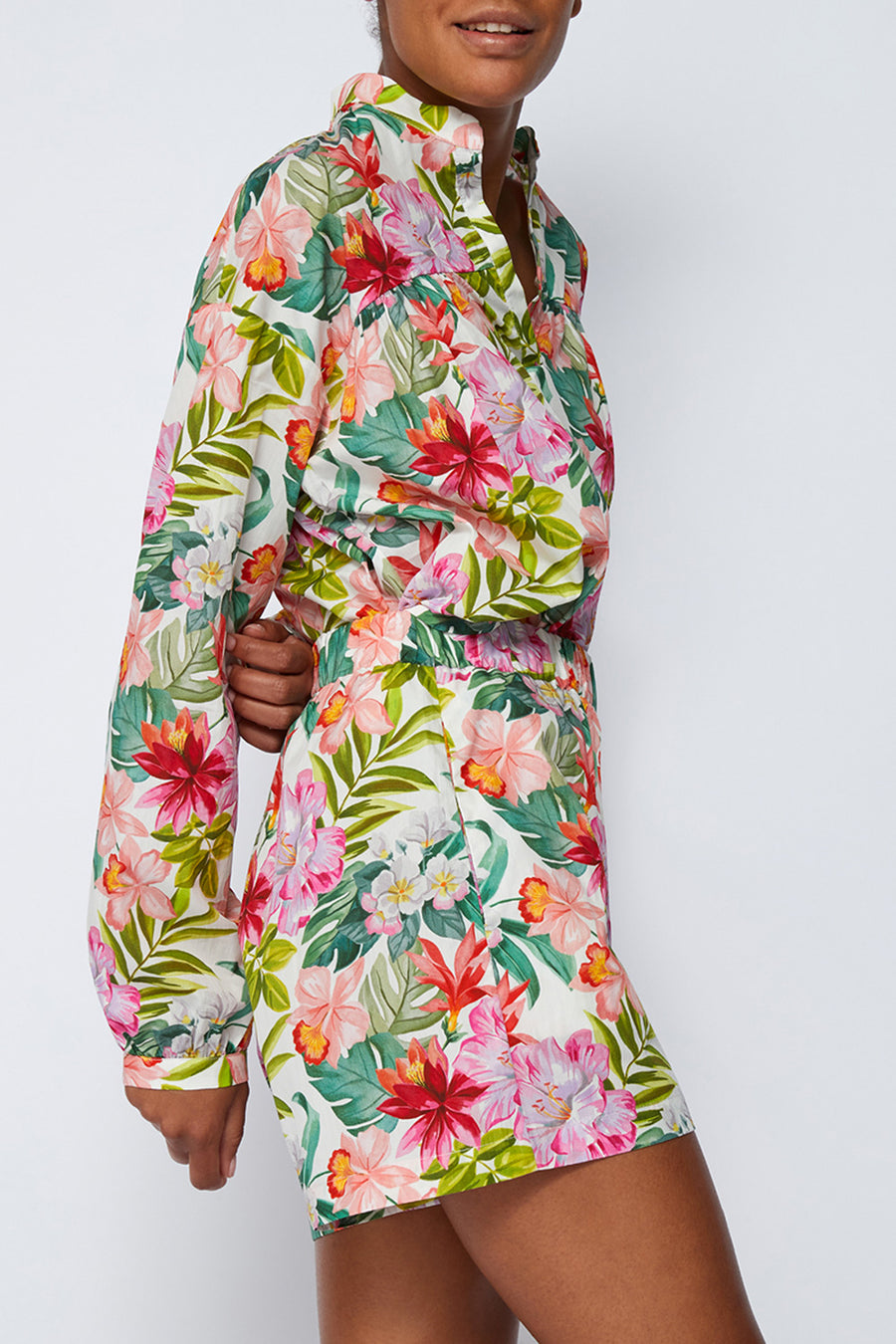 Let yourself be inspired by the floral print that characterizes this cotton blouse with mandarin collar. Perfect for moments of relaxation in the city to complete casual looks with a touch of great personality. Complete your Spring Summer wardrobe with this shirt, which can also be combined with coordinated shorts.