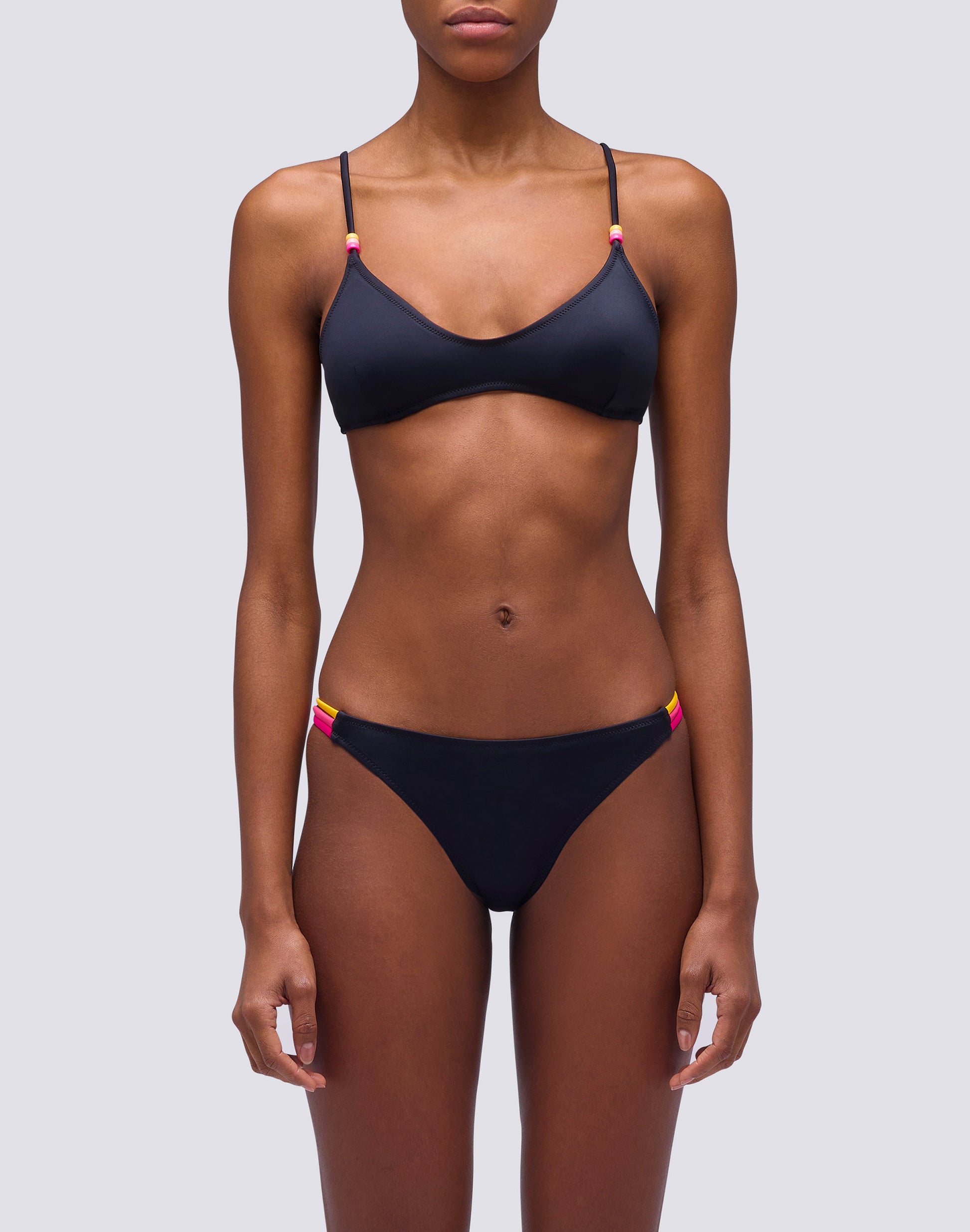 If you love trendy designs, you can count on this beach bikini consisting of a padded bralette top with multi-coloured beads and a Brazilian-style bottom with three-coloured bands at the hips.