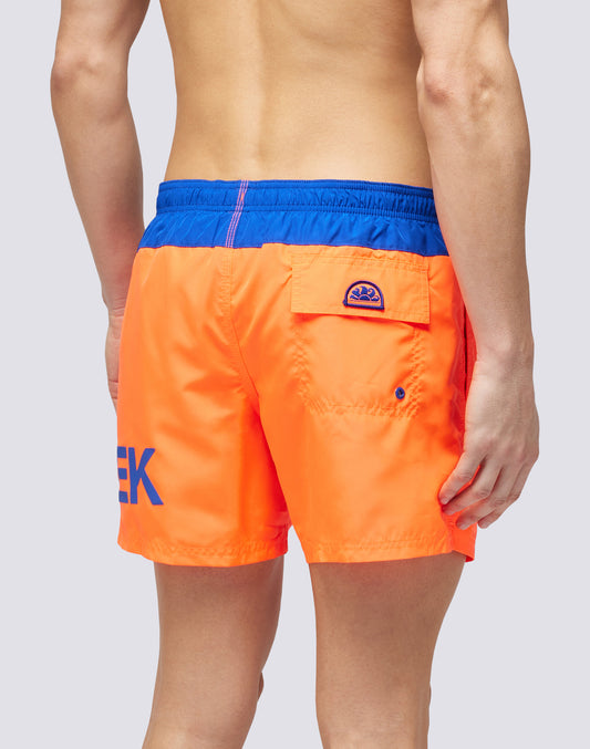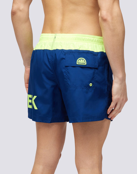 ICÓNICO BAÑADOR CORTO DE TAFETÁN CON CINTURA ELÁSTICA Y RIBETES EN CONTRASTE