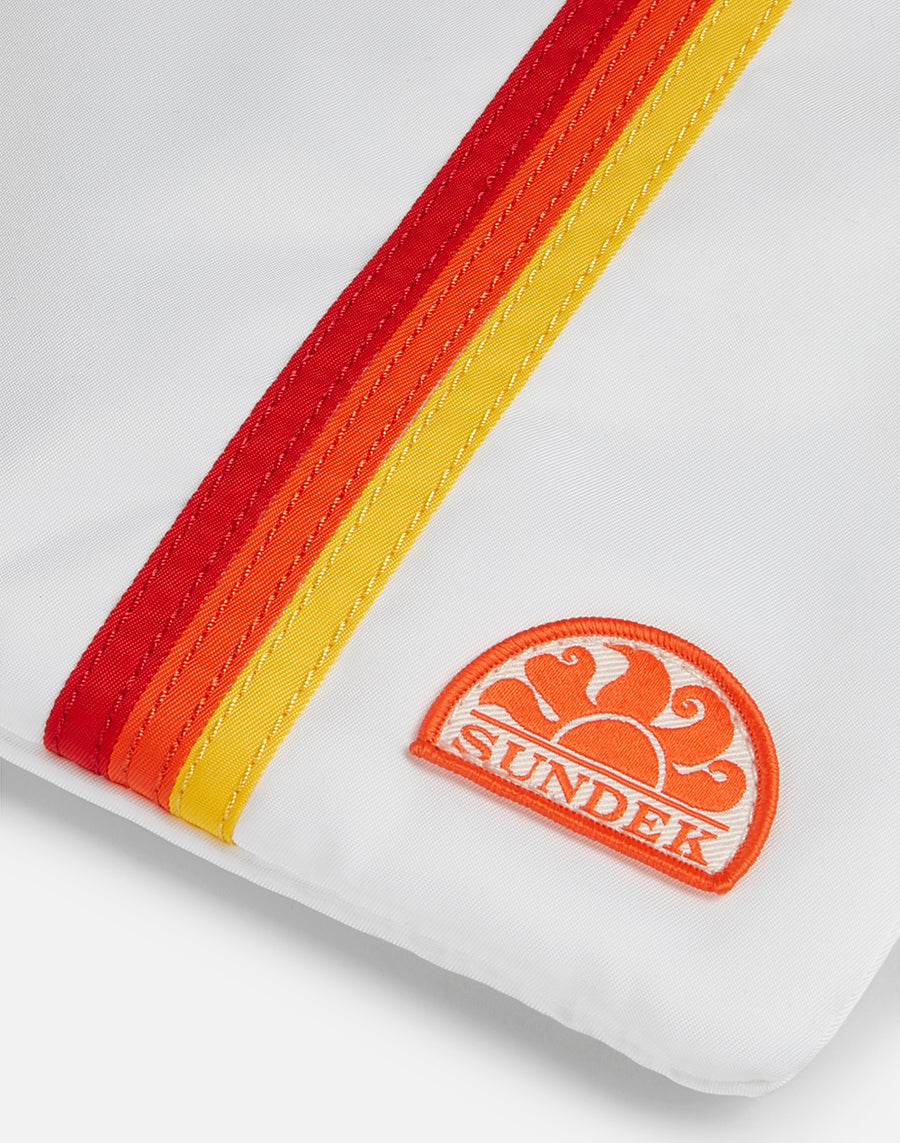 Pochette de playa ligera y forrada con el icónico detalle de las cintas tricolor para guardar y proteger los básicos que prefieres tener a mano. Perfecta para llevar en el bolso o sola gracias a la práctica correa de muñeca.