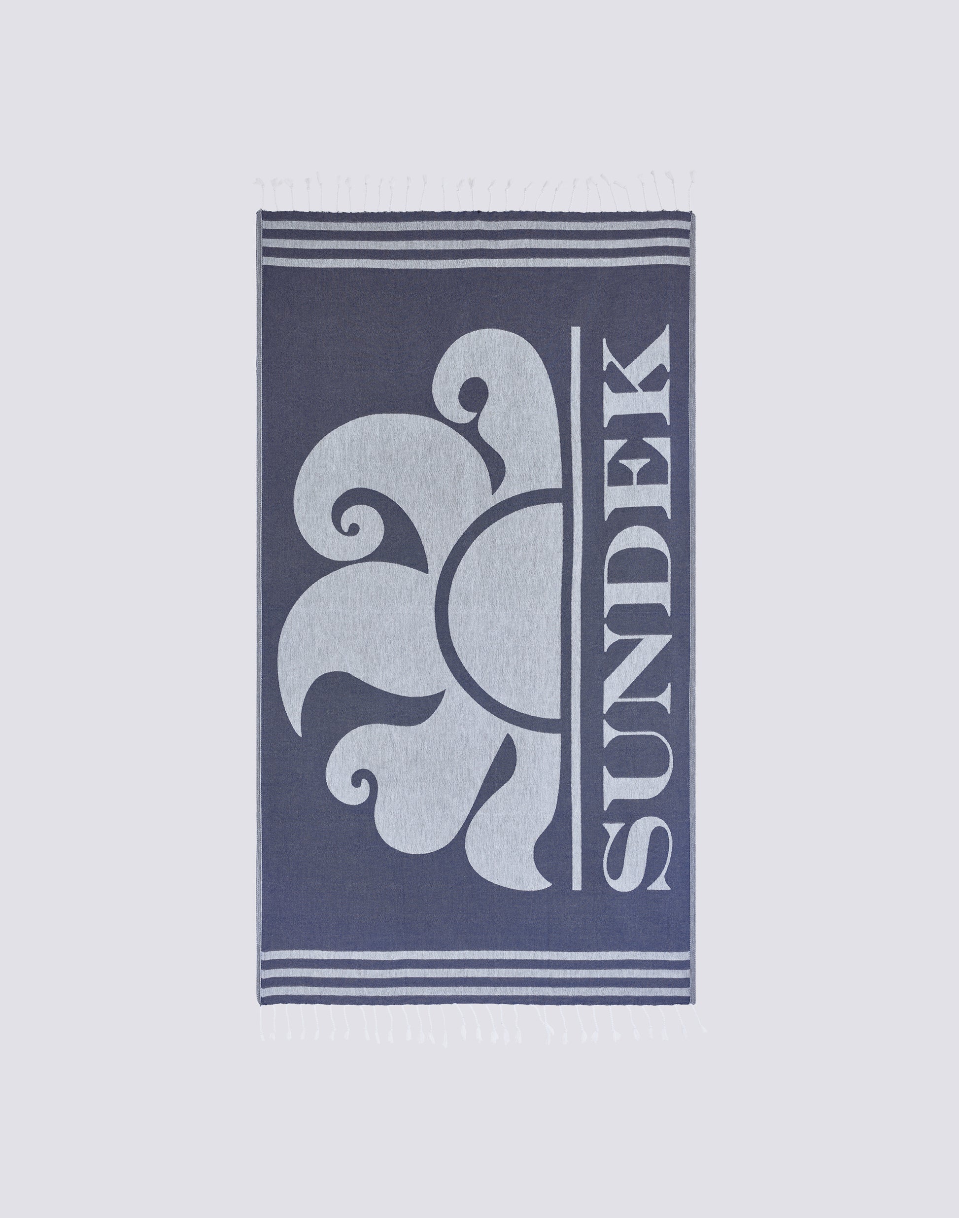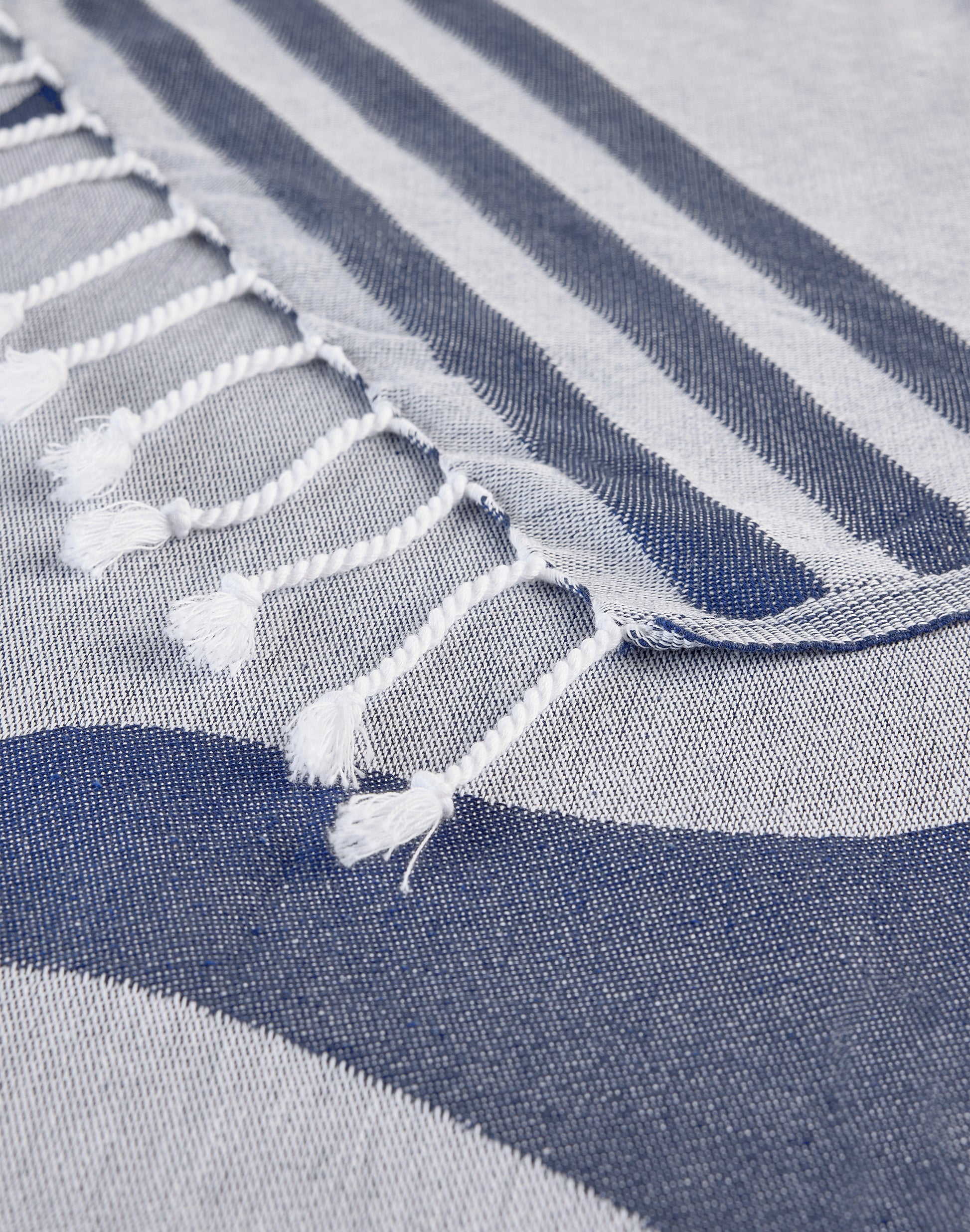 Toalla de playa tipo fouta de jacquard con maxilogotipo a contraste con rayas verticales y bajos tejidos con flecos. Largo: 100x170cm. Peso: 360 g.
