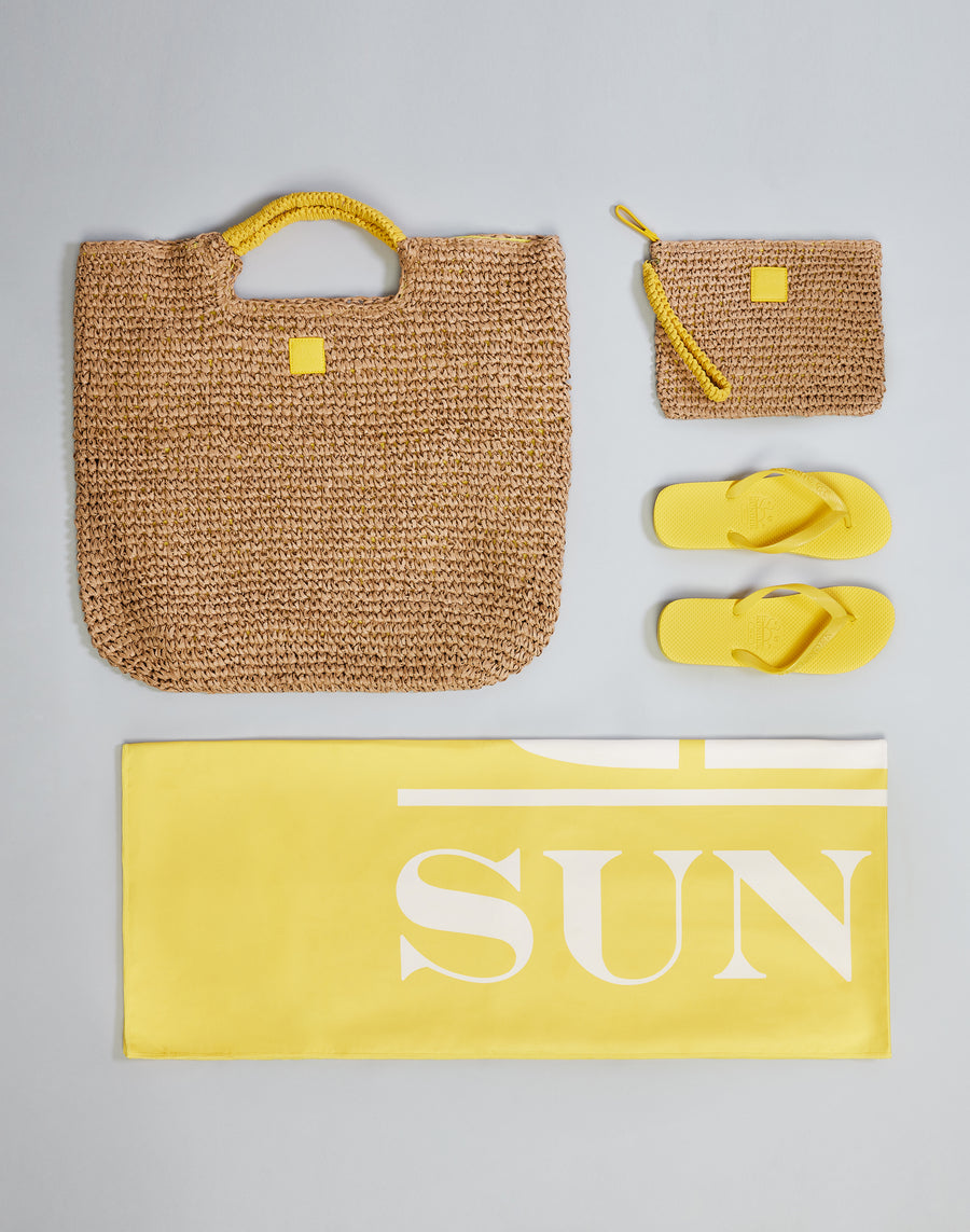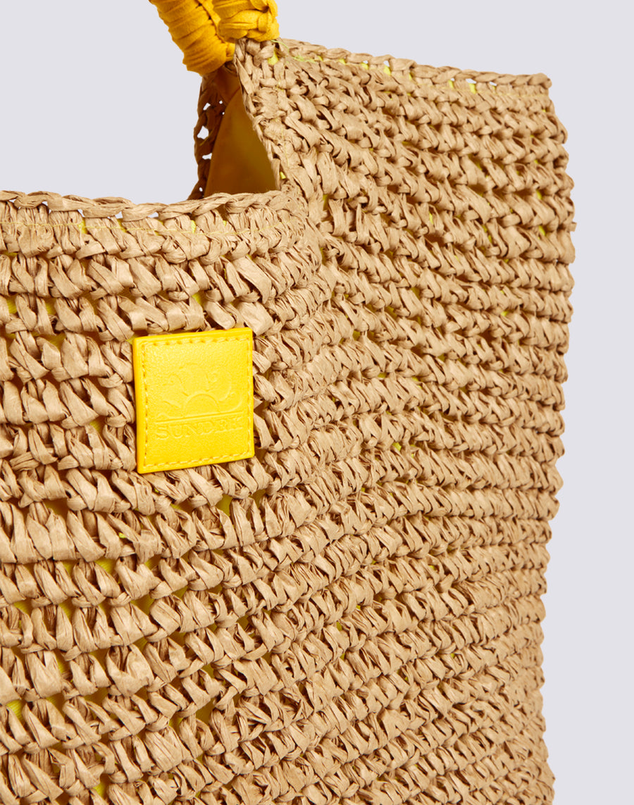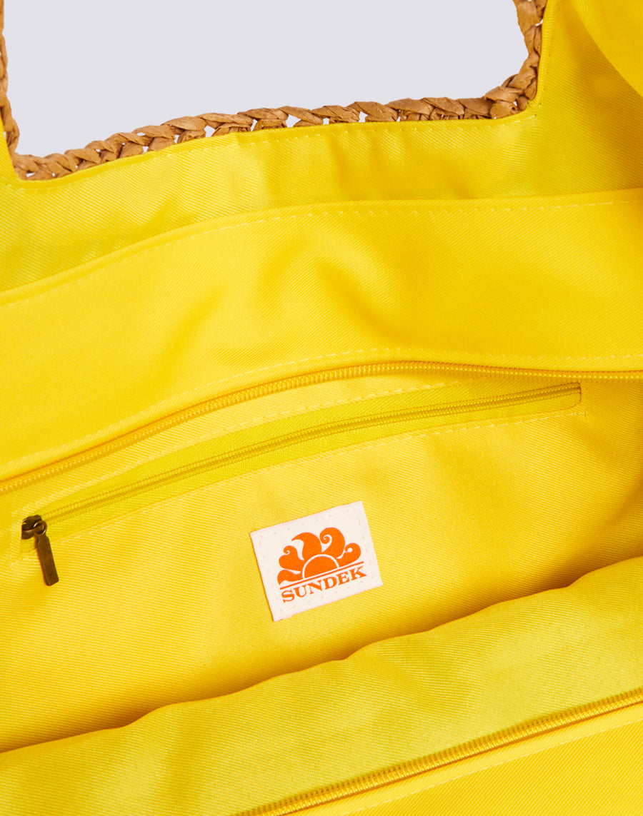 Bolsa de la compra de papel efecto paja con asas en contraste. Amplia, con cierre central de cremallera, es ideal para pasear o como bolsa de playa.