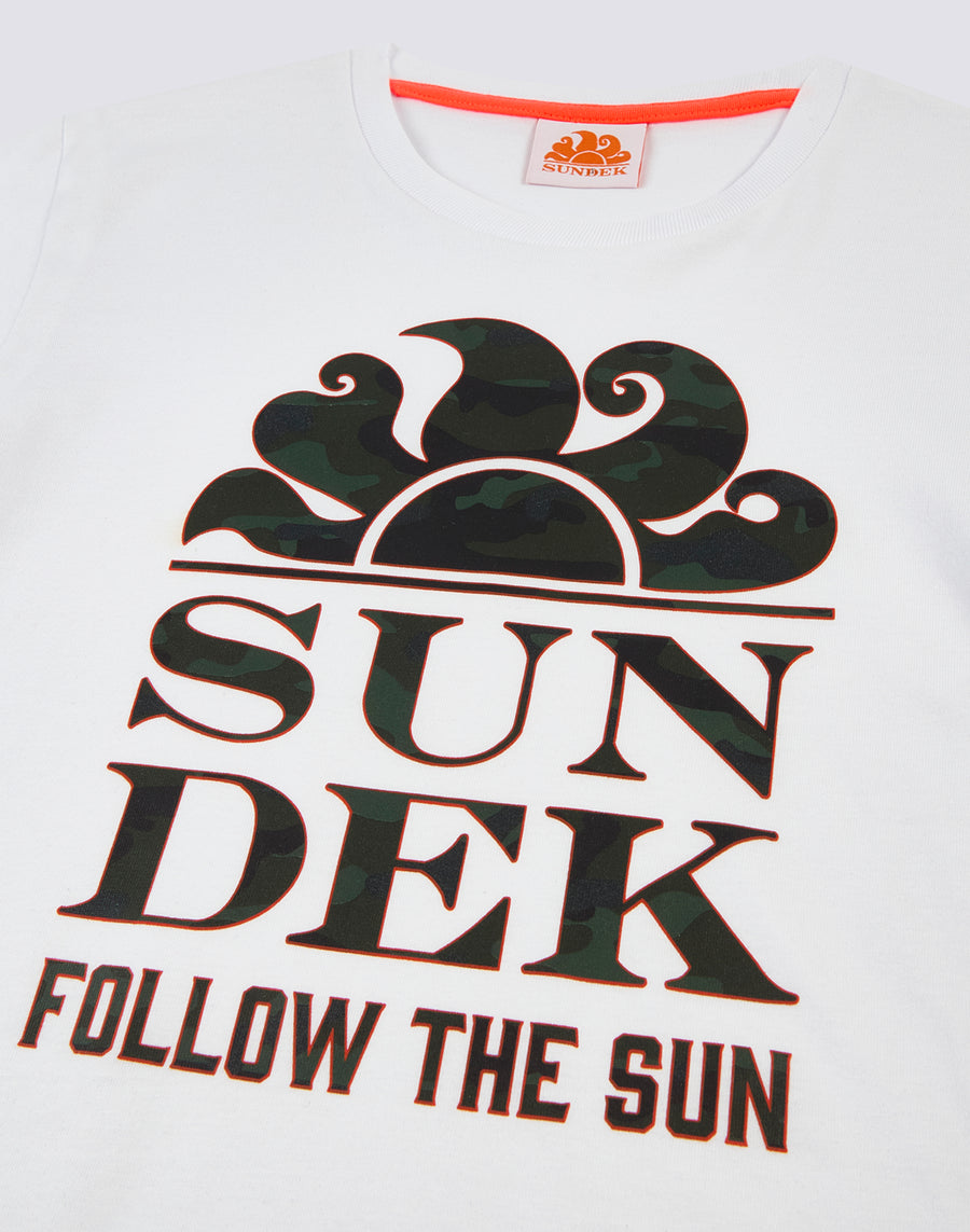 El logotipo Sundek Follow the sun cobra protagonismo en versión camuflaje en esta camiseta de niño versátil y cómoda. Para llevar en cualquier ocasión y aportar un toque atrevido al look de los más pequeños.