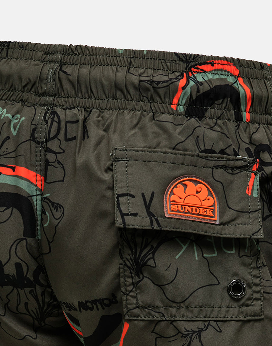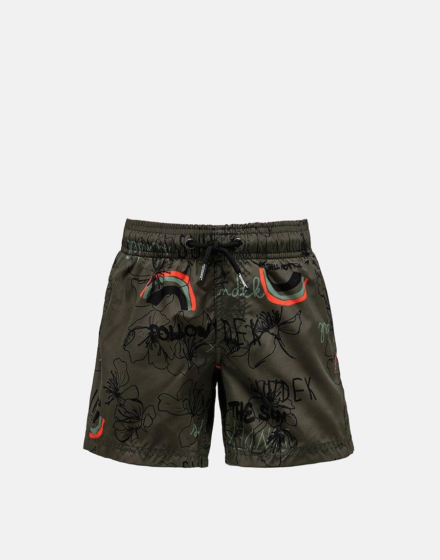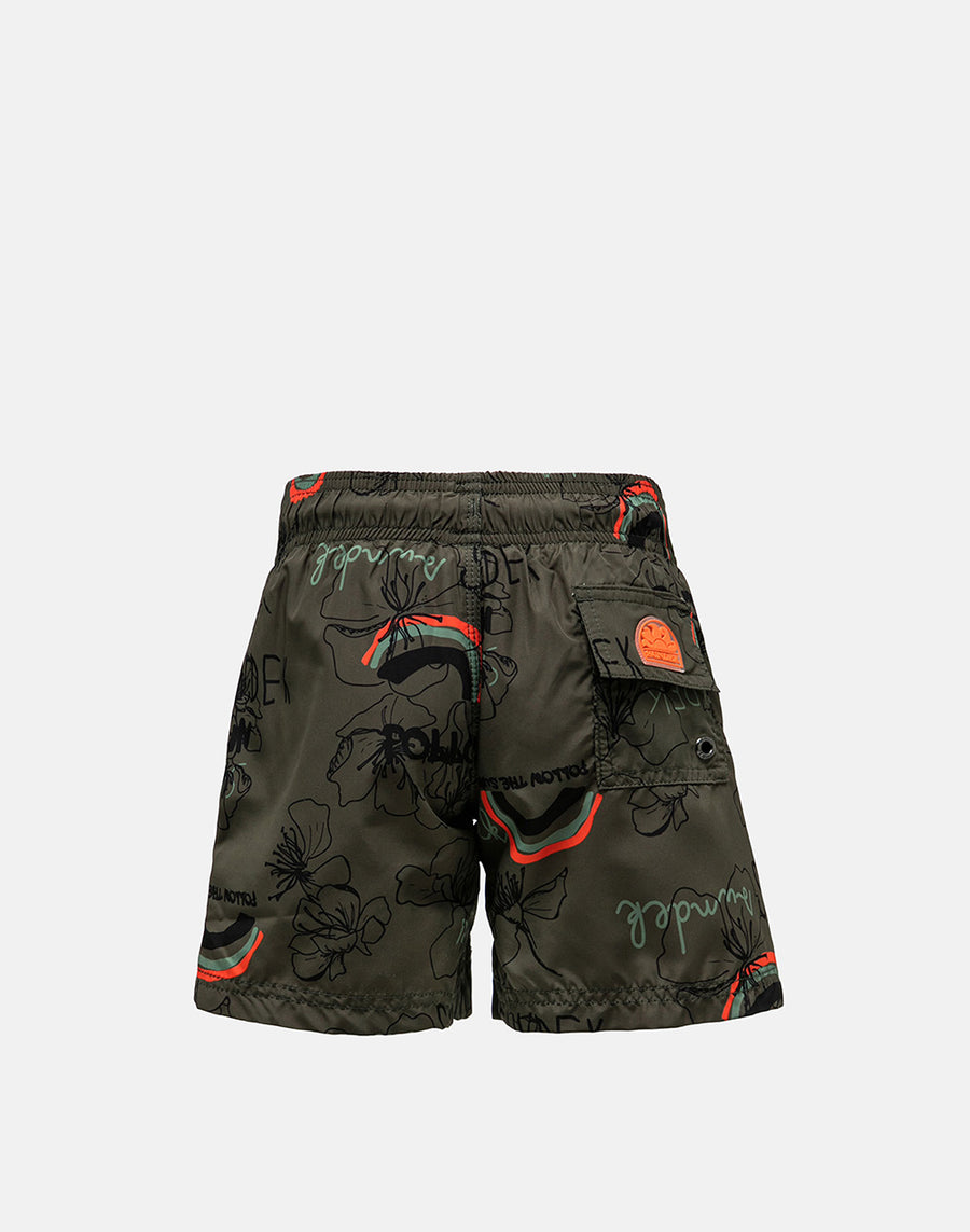 El estampado floral de este bañador de niño se superpone a un diseño naïf que hace que los gráficos sean divertidos y originales.