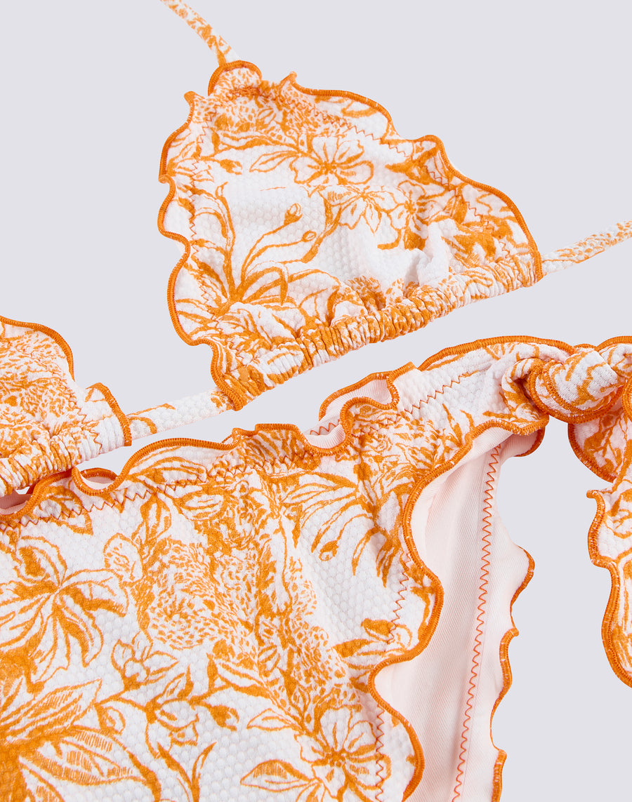 Mini bikini Magnolia compuesto por un top de triángulo ajustable con volantes y una braguita con volantes y lazos. Estampado Fleur de Joie y tejido Piquet. Modelo a juego para un look mix&match en la playa.