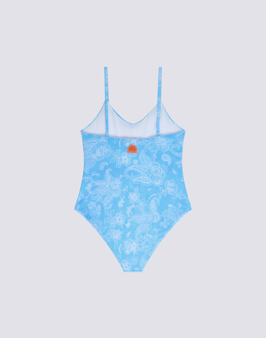 Bañador de una pieza para niña con estampado Hibi Paisley estilo bandana, con escote en V delantero y espalda bastante abierta.