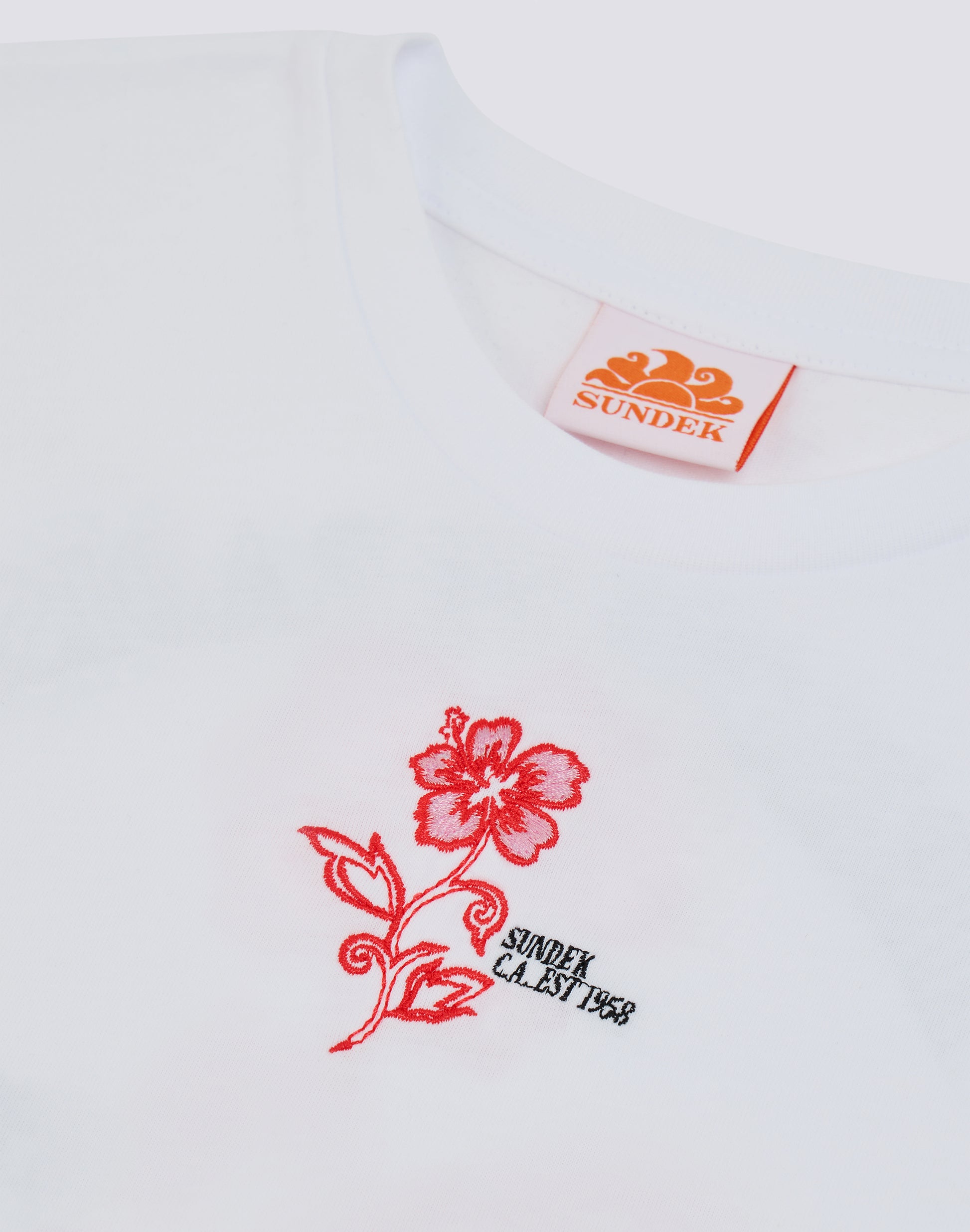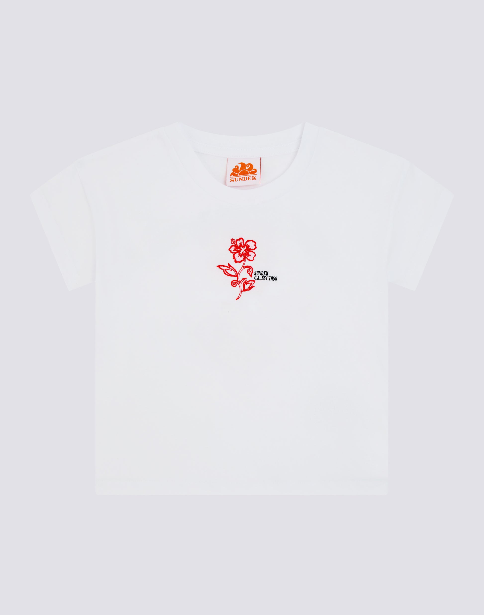 Cómoda camiseta de manga corta para niña con hibisco bordado en la parte delantera y estampado maxi Hibiscus Paradise en la espalda.