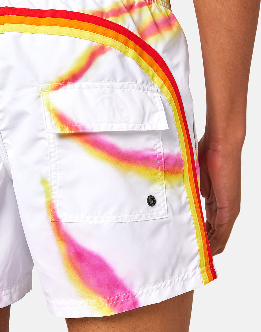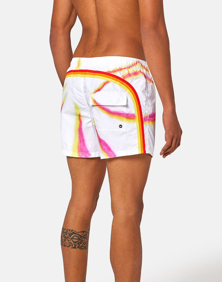 Boardshorts con motivo especial tie-dye, tratados y teñidos con técnicas artesanales. El tejido histórico y la confección del modelo lo hacen ultrarresistente temporada tras temporada.