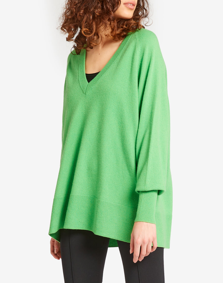 Suave mezcla de lana merina para este jersey con amplio escote en V de línea holgada. En una mezcla de lana muy suave, el clásico jersey con escote en V se consolida como un must de la temporada para combinar con vaqueros y faldas.