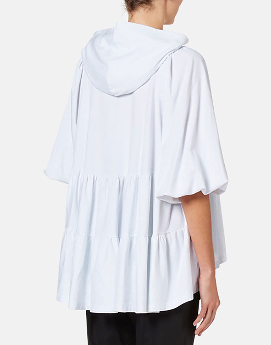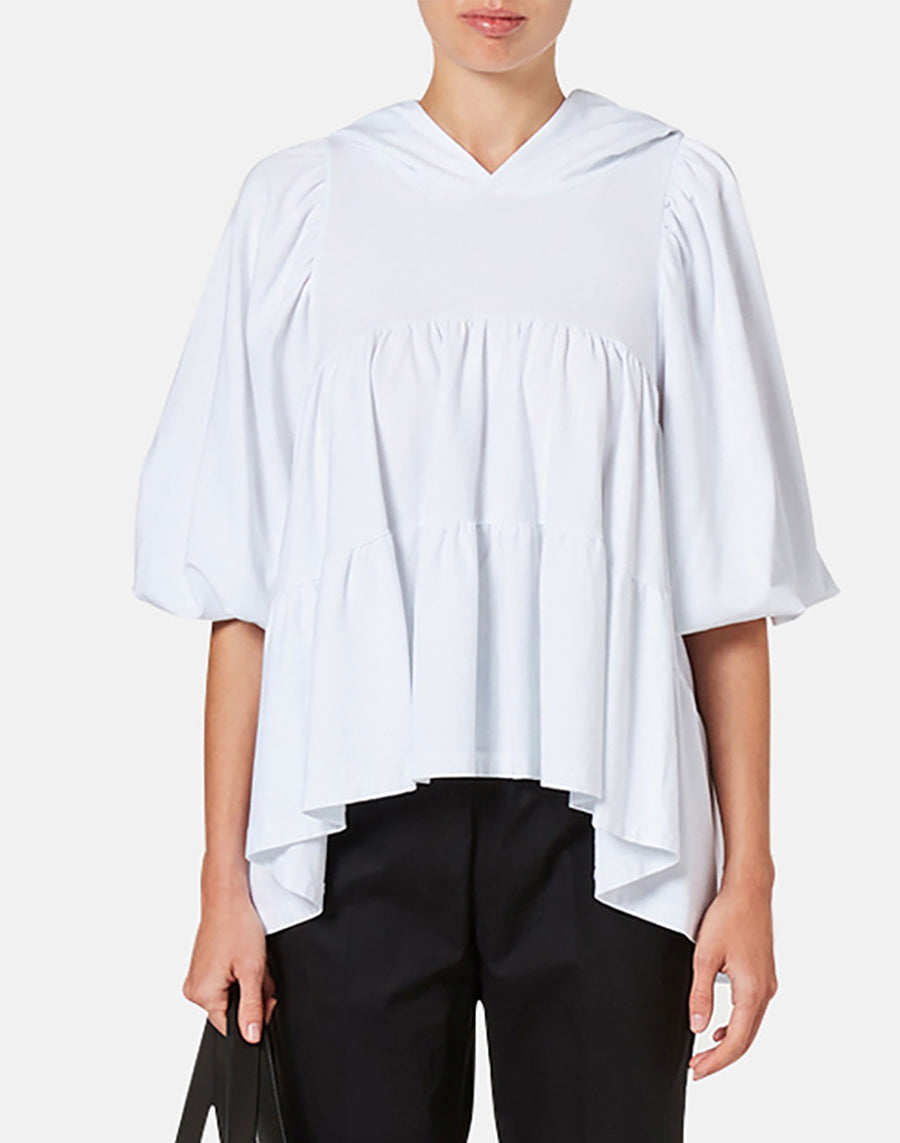 Easywear femenino con la sudadera de punto de algodón stretch con volantes y cuello con capucha. Con vaqueros, shorts o pantalones