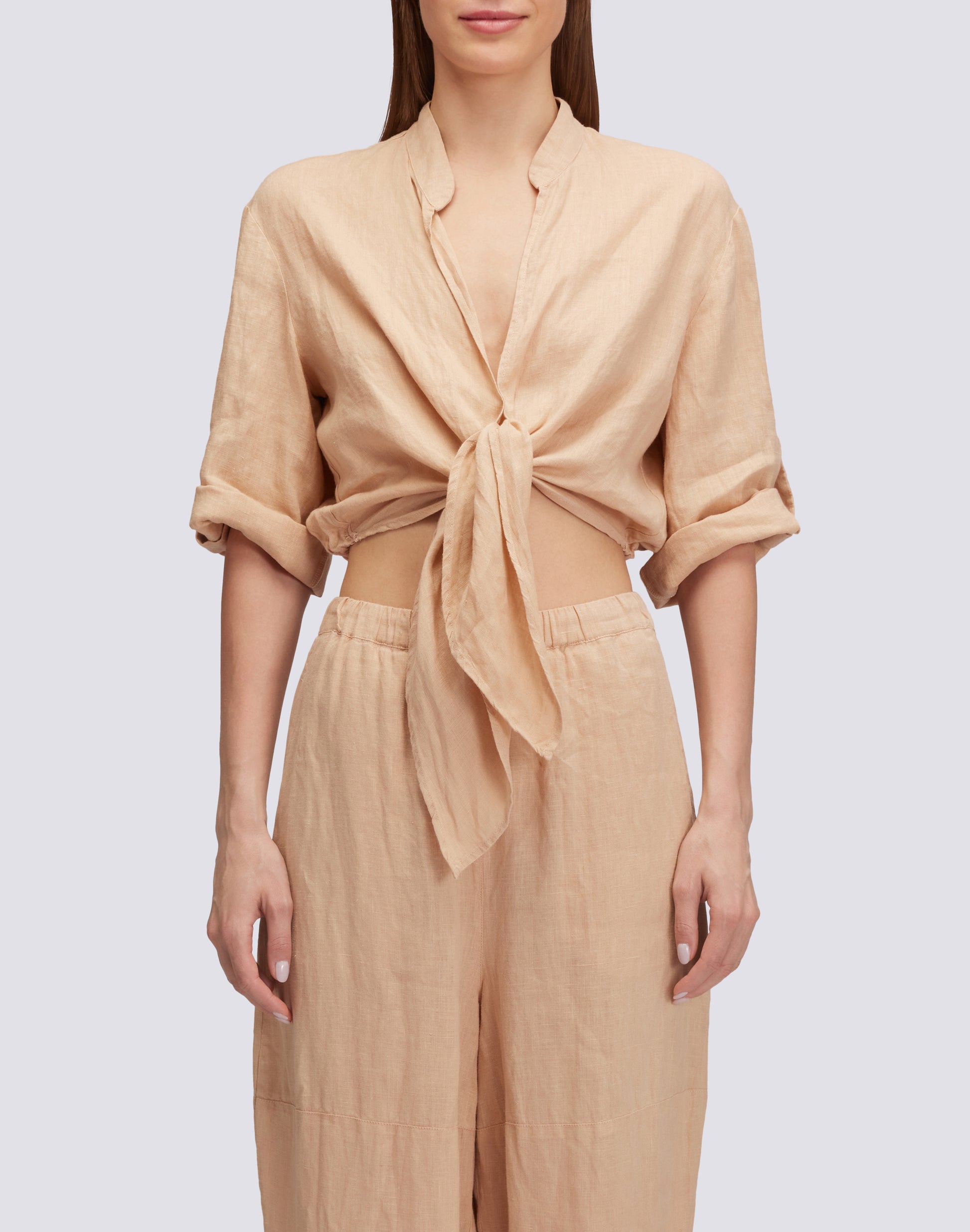 Camisa de lino teñido en prenda con corte cropped y cierre de nudo, mangas fruncidas y cuello mao. Fresca y desenfadada, para looks informales y desenfadados.