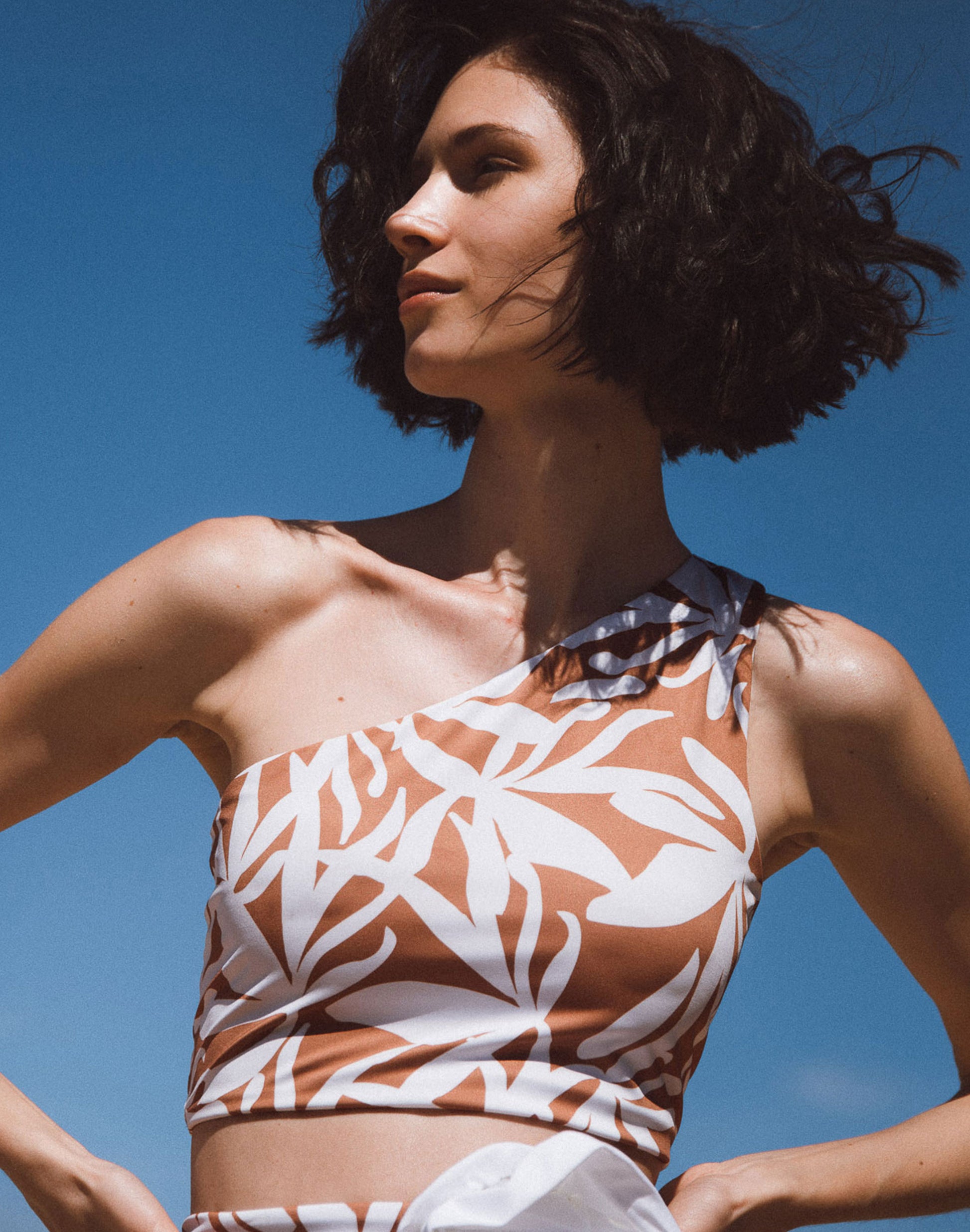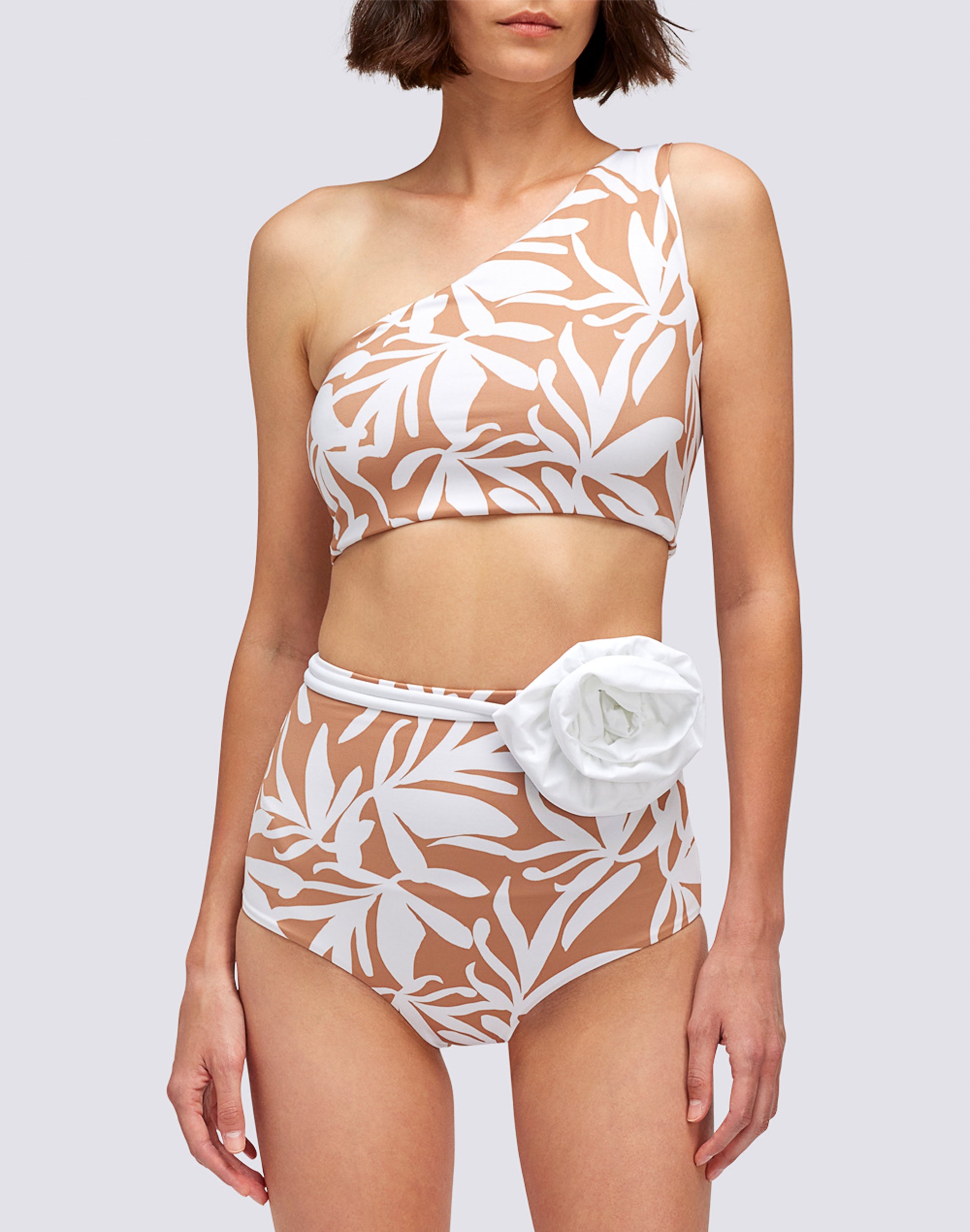 El top de un hombro BIMALA, con su estampado de flores ópticas, te hará sentir elegante y a la moda, para que siempre estés glamurosa incluso en los días de playa. Combínalo con la braguita de bikini a juego.
