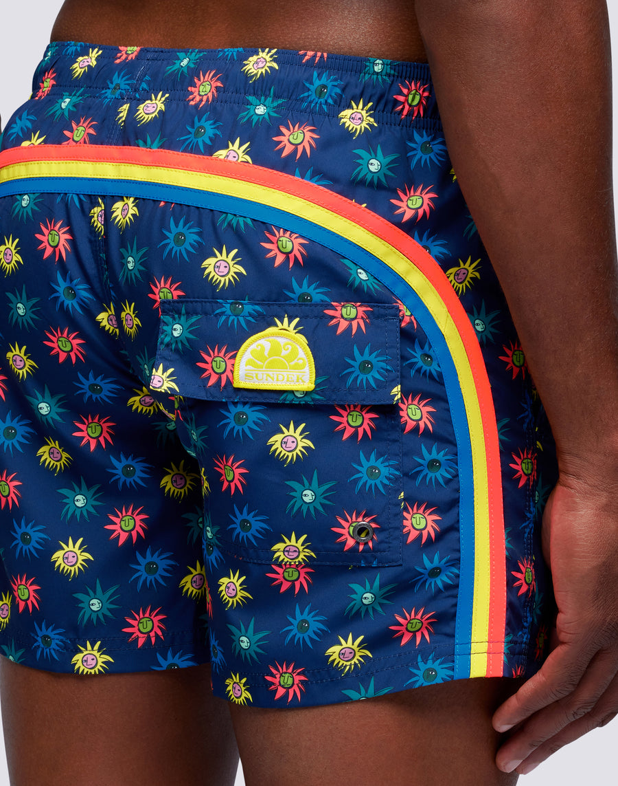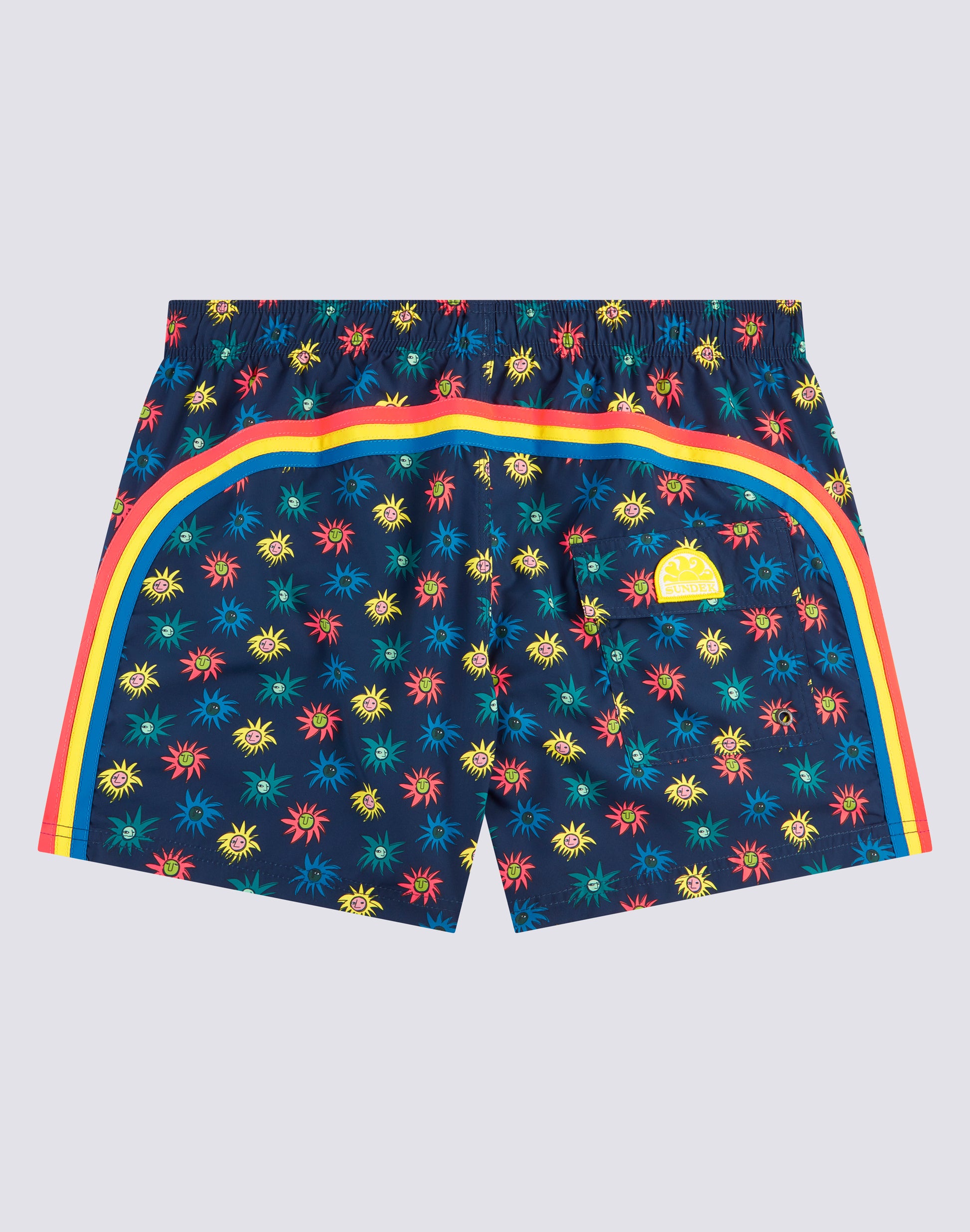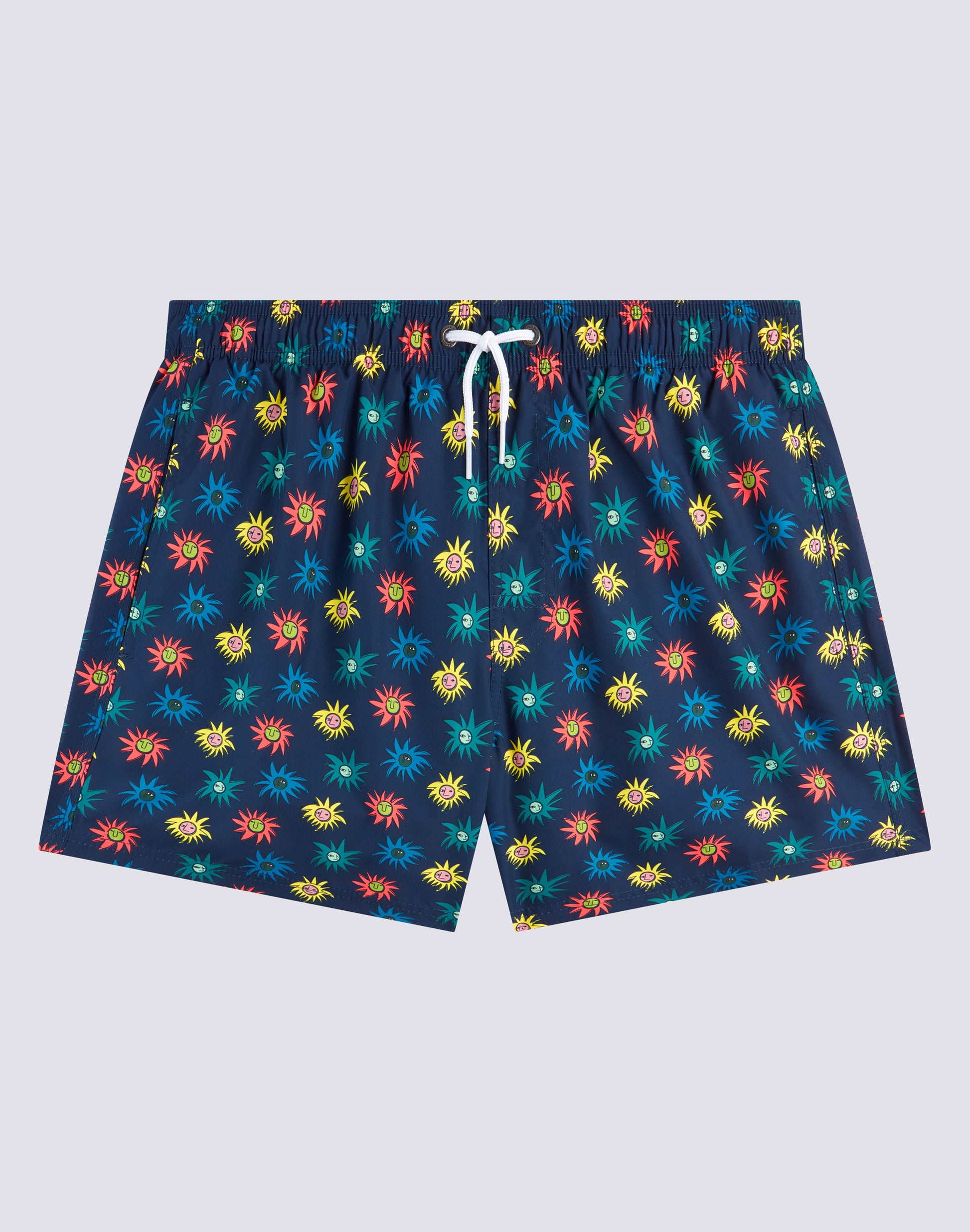 Bañador con cintura elástica con cordón, en ligero tejido reciclado Repreve® fabricado con botellas de plástico. Detalle icónico del arco iris en la espalda y microestampado Lion Sun. Manga 14"/35 cm (talla m).
