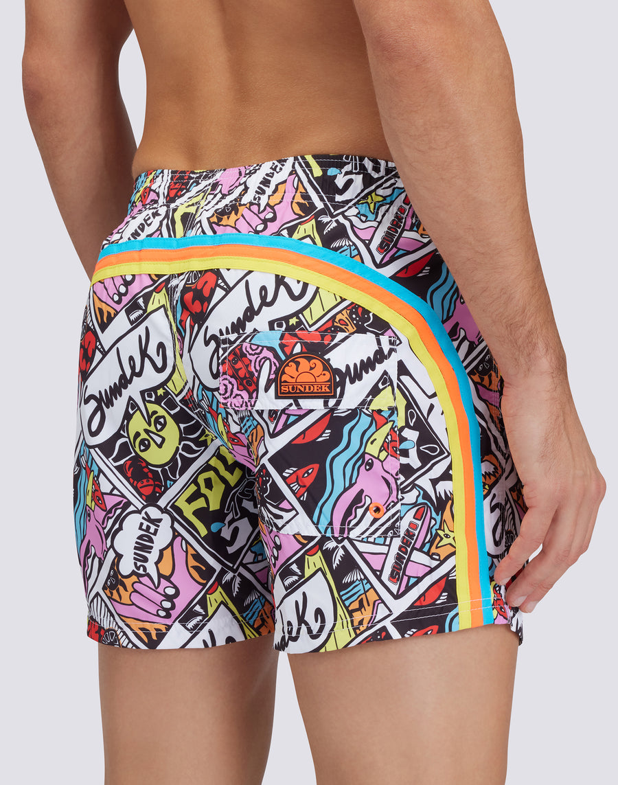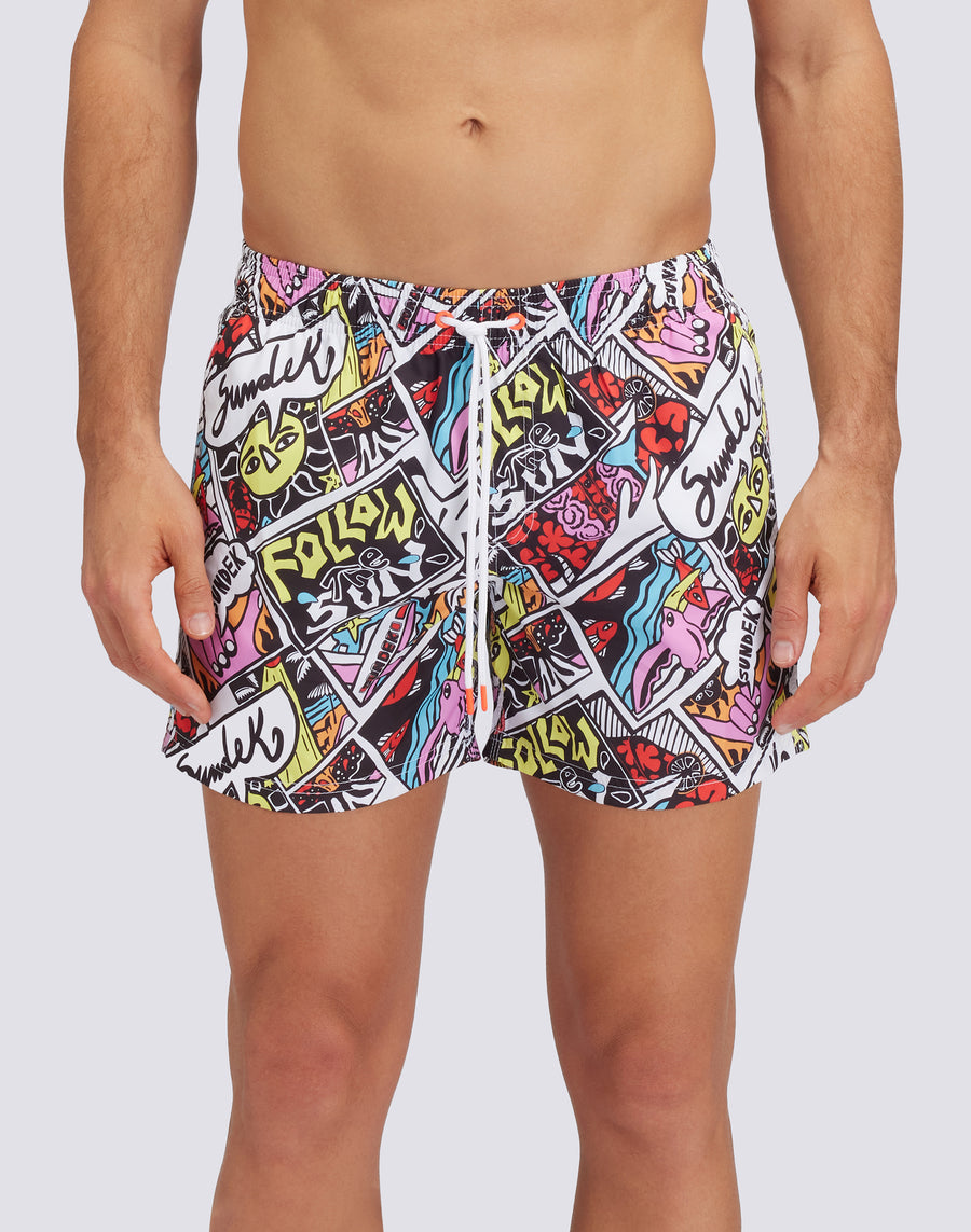 Bañador con cintura elástica con cordón, de tejido ligero Repreve® reciclado a partir de botellas de plástico. Con estampado de dibujos animados y el tradicional arco iris Sundek en la espalda. Longitud exterior del muslo 14"/35 cm (en talla M).
