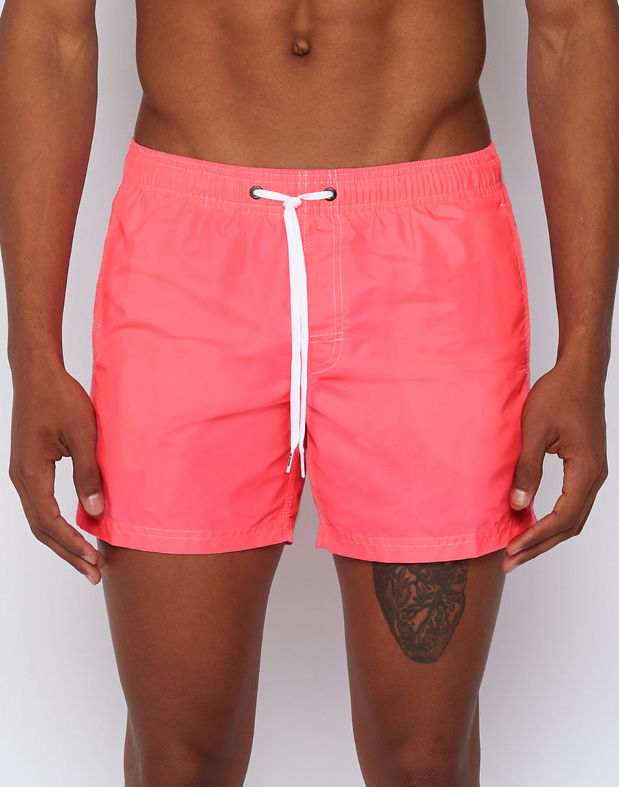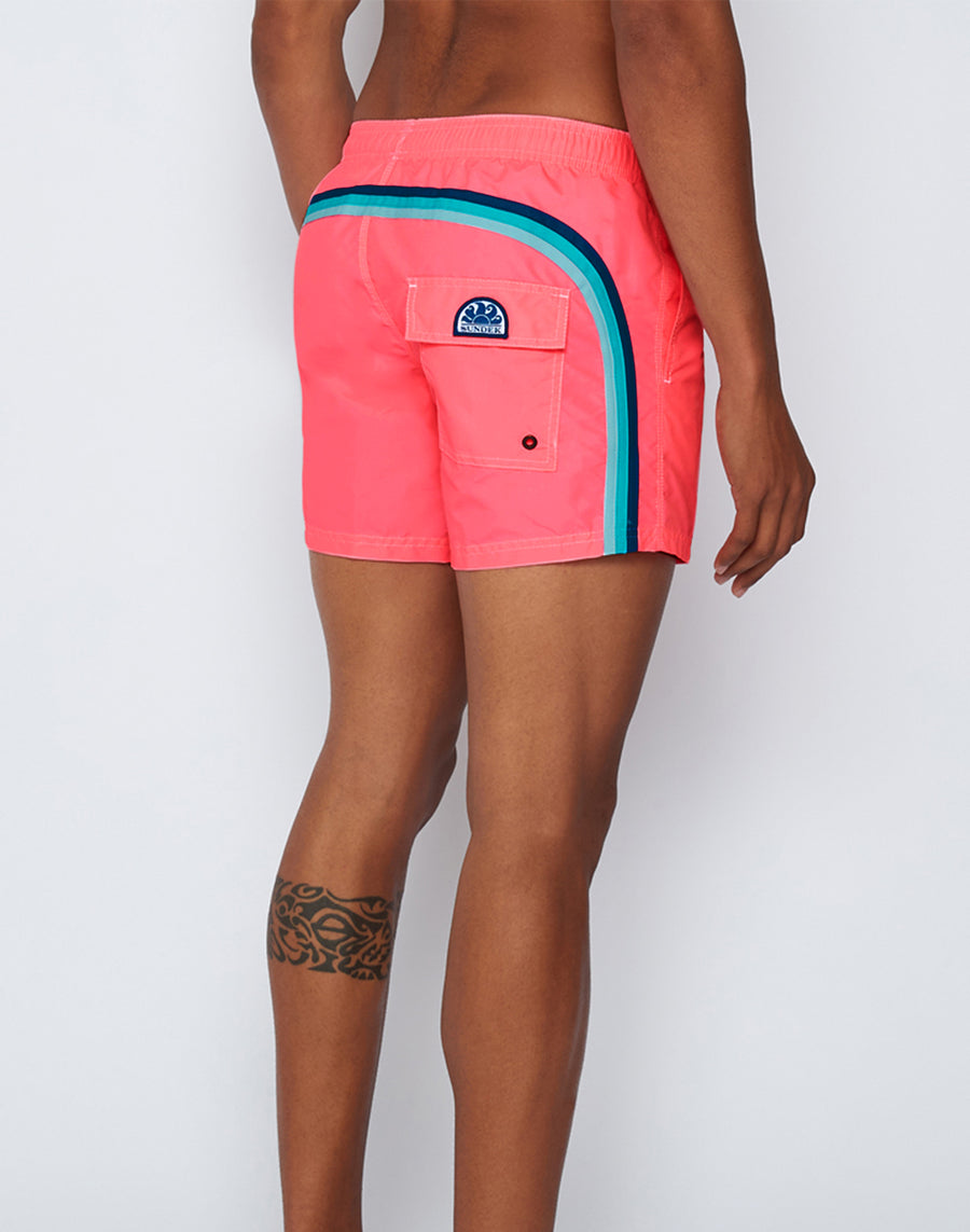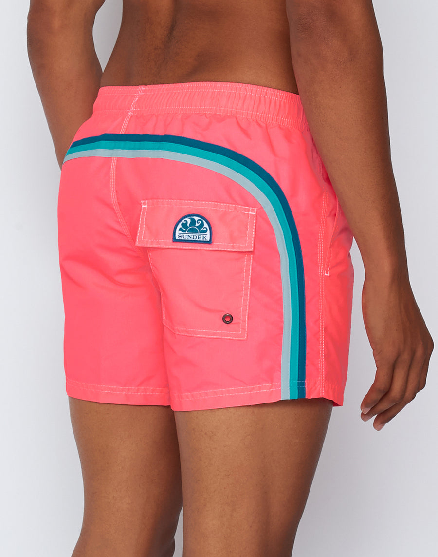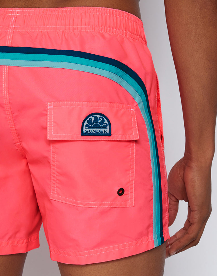Pantalones cortos de mar para hombre con cintura elástica, cordón y el icónico arcoíris de Sundek en la espalda. Este traje de baño está hecho con costuras de tres agujas y 100% de nuestro tejido heritage, nylon-tafetán: suave como la seda, ligero y resistente a todo, se seca muy rápido para brindarte comodidad en todas partes, en las olas y fuera del agua. Longitud 35 cm (tamaño M), medido en el lado externo de la pierna.